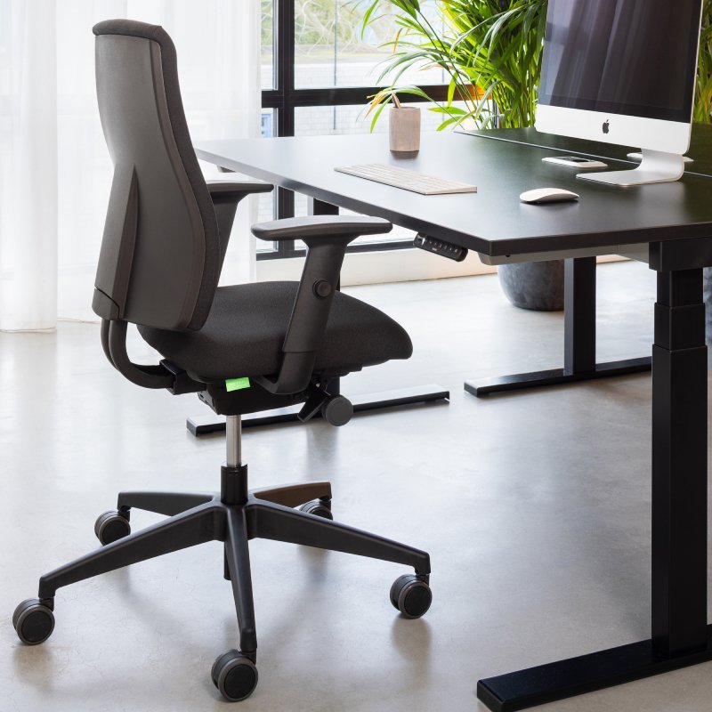 Het voetkruis van de ergonomische bureaustoel is van kunststof in de kleur zwart. Het onderstel bestaat uit universele dubbele wielen, geschikt voor een harde of zachte vloer. De zitting van de bureaustoel is standaard bekleed in Lucia (Phoenix) stoffering. De stoel in het zwart i.c.m. 2D armleggers, is uit voorraad leverbaar en wordt gratis gemonteerd geleverd met een levertijd van ca. 1 week. De stoel in andere kleuren en/of in combinatie met andere opties is standaard ongemonteerd en heeft een levertijd van ca. 5-6 weken (gemonteerde levering is tegen meerprijs mogelijk).