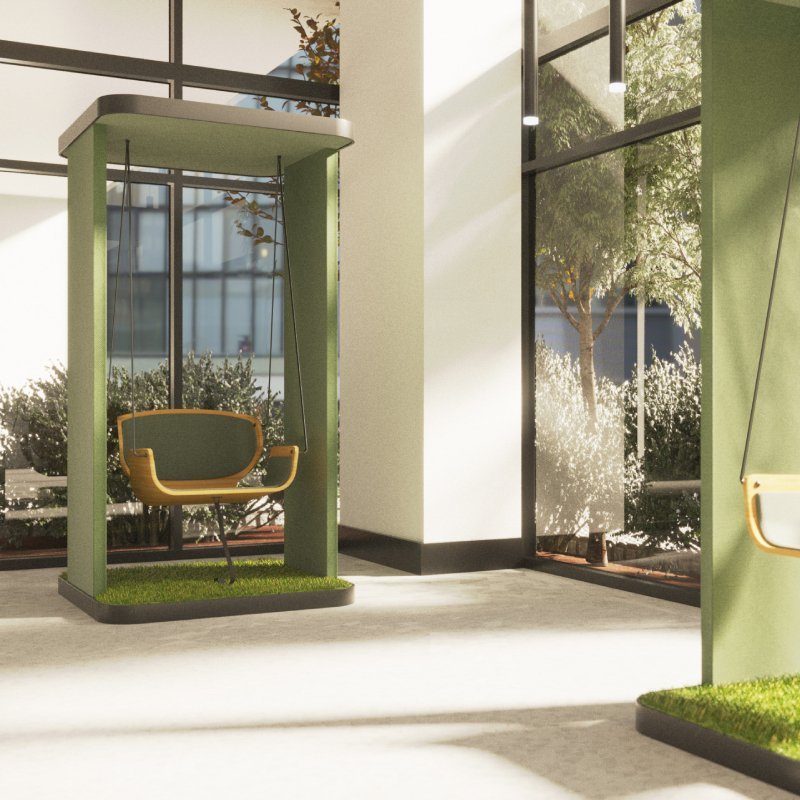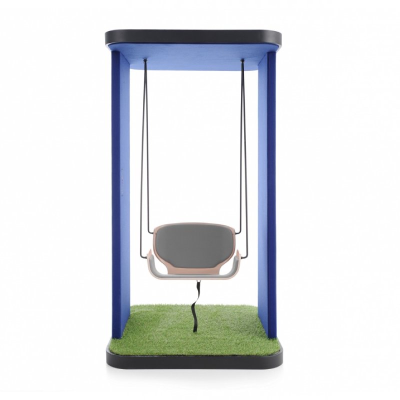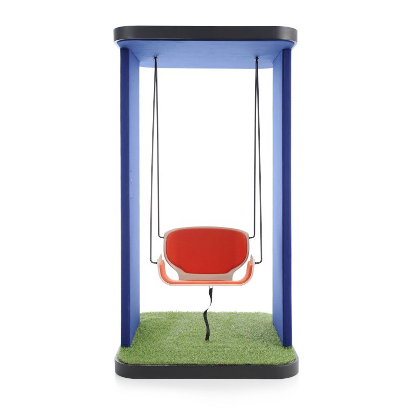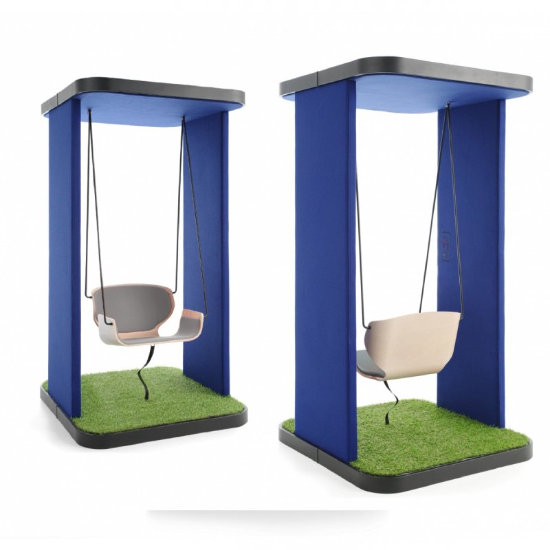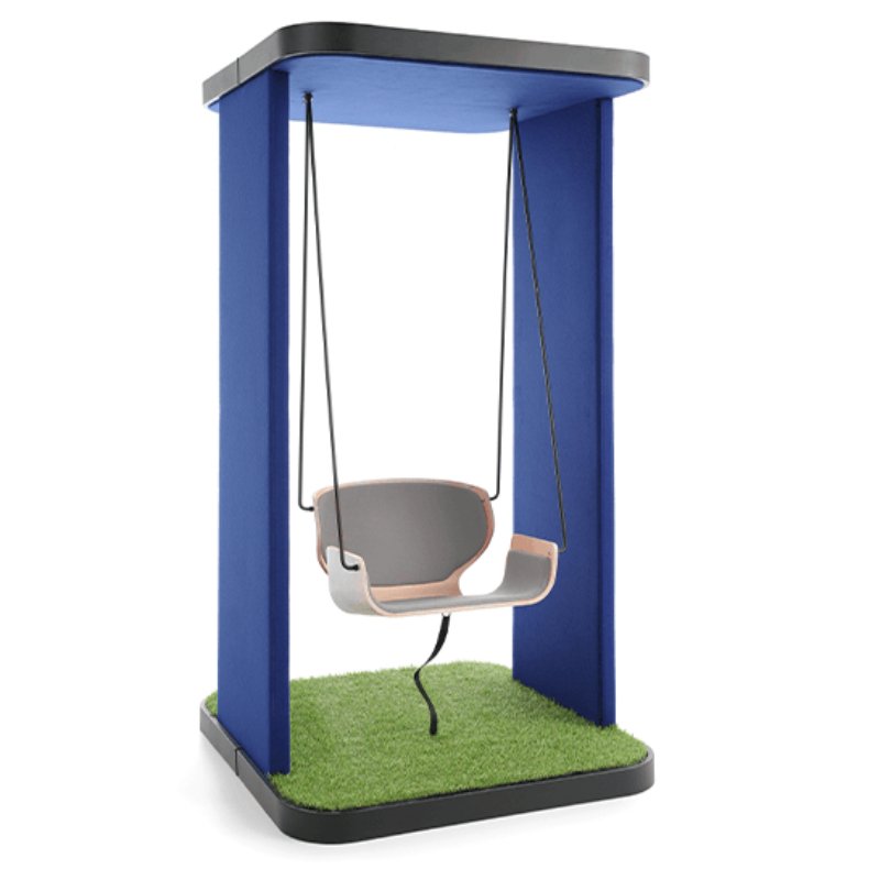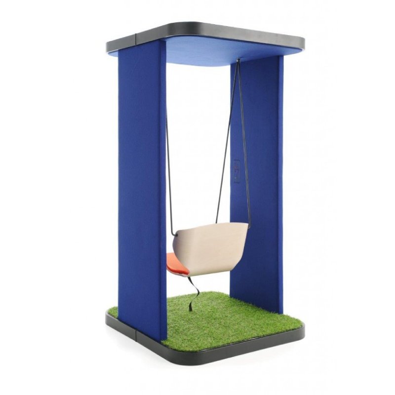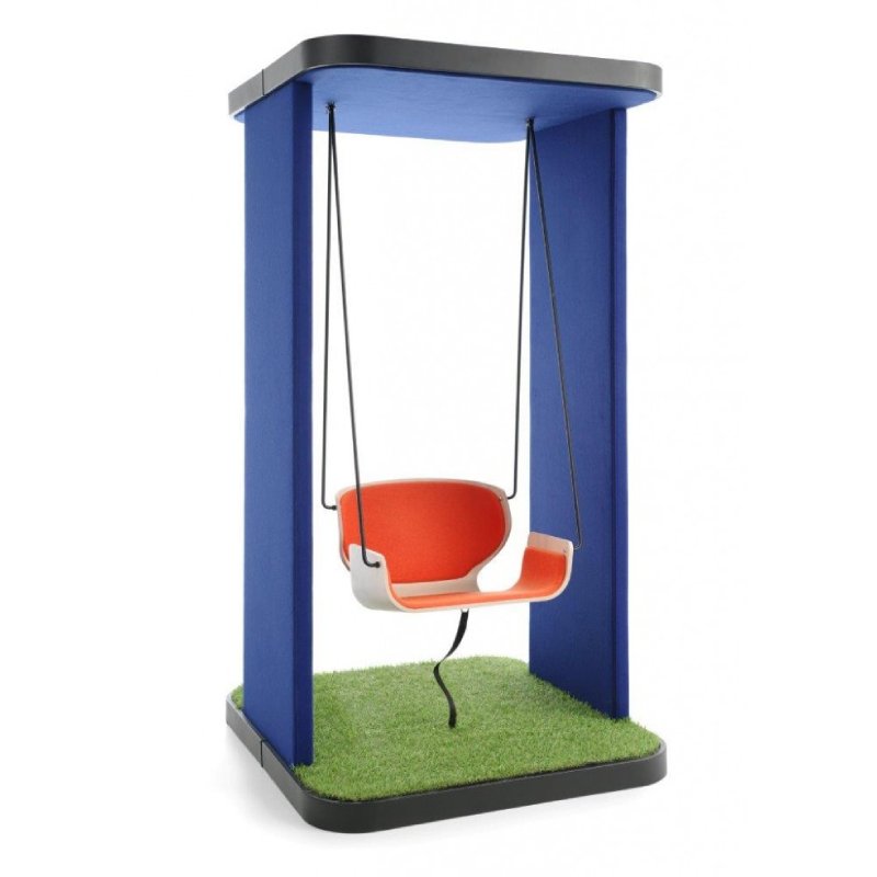 Akoestische schommelstoel Social Swing voor de speelse werkomgeving. Deze unieke kantoormeubel bestaat uit een schommel met een solide frame zodat de unit vrij in de ruimte kan staan.