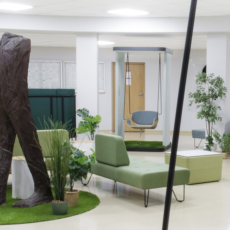 In de zitting van de kantoor schommel zit een foamlaag verwerkt wat zorgt voor een zeer prettig zitcomfort. De vloer is bedekt met kunstgras en de wanden van het frame van de social swing zijn voorzien van een foamlaag en zijn bedekt met stoffering.