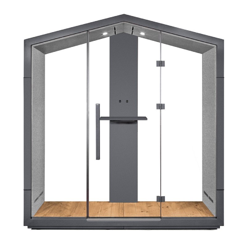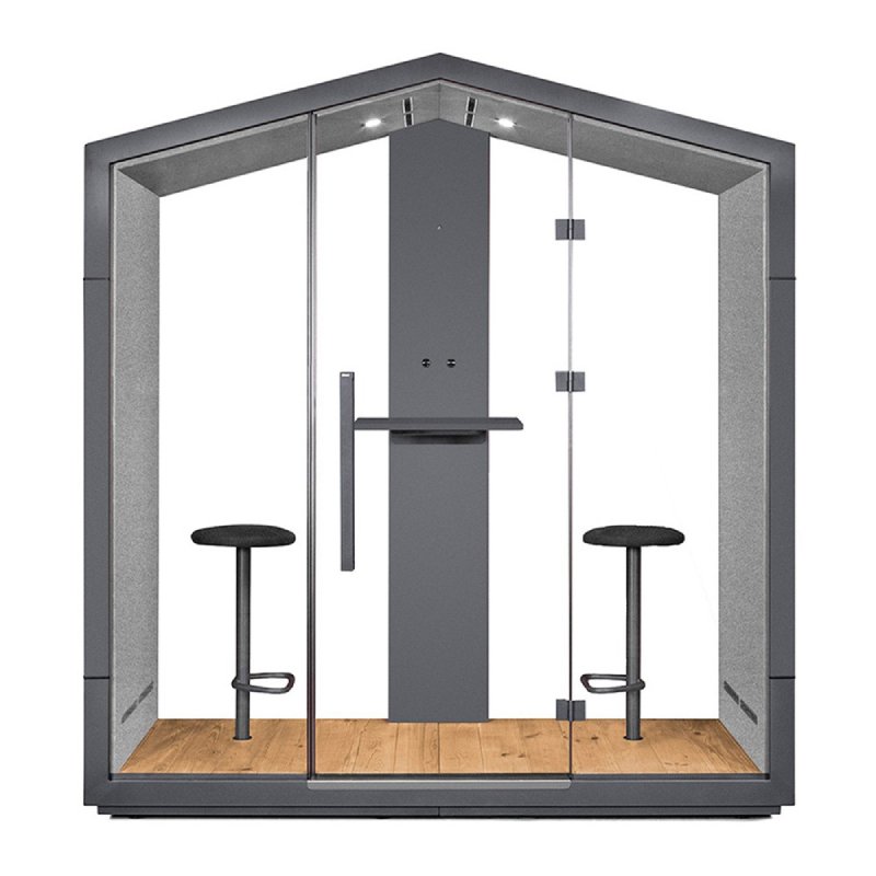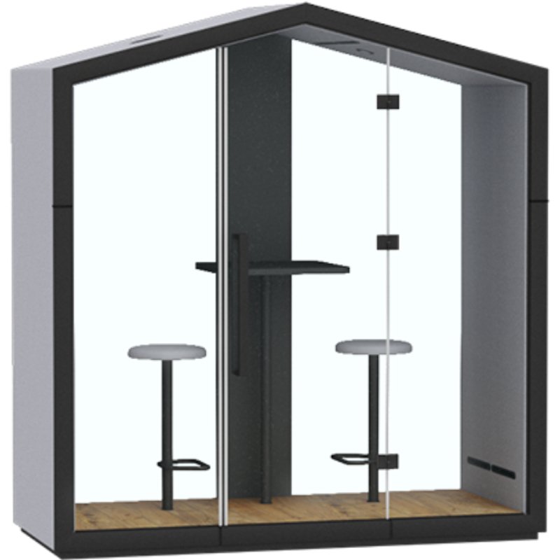 Akoestische vergaderplek Treehouse G1 is een afgesloten stilte cabine die je in jouw kantoorinrichting of op school kunt plaatsen om in alle rust en met de nodige privacy telefoongesprekken te voeren, achter uw laptop te werken, een zoomconference te houden of een overleg met zijn tweeën.
