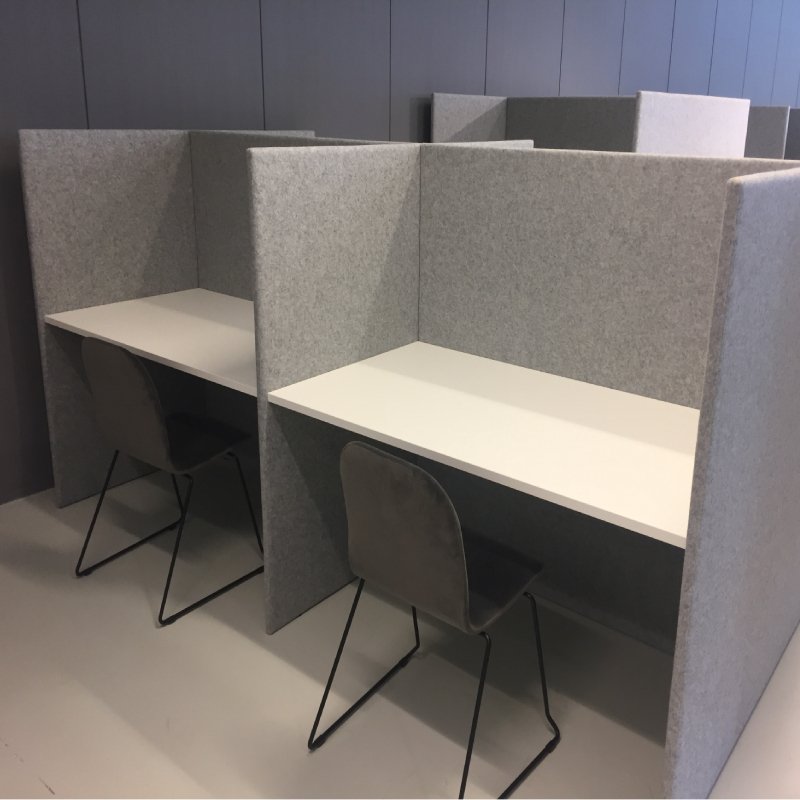 Kies zelf de mate van geluiddemping door 32 mm of 62 mm paneeldikte te kiezen. De wanden in 120 cm, 140 cm of 160 cm hoog zijn standaard voorzien van stelvoetjes.