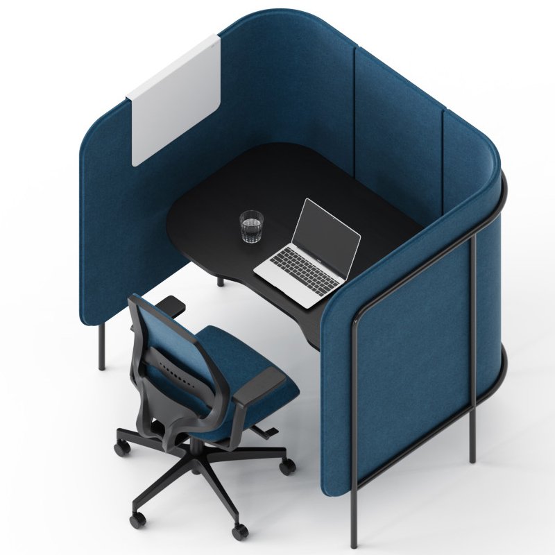 Akoestische werkplek Leaf Pod bestaat uit een tafel en panelen die je gedeeltelijk afschermen voor de nodige privacy. Met deze geluiddempende modulaire unit heb je in een kantoorinrichting een rustige werkplek