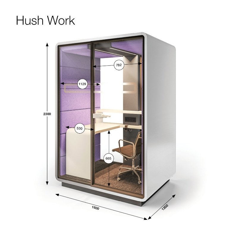 HUSH Work is een moderne werkplek die van alle gemakken is voorzien. De concentratie werkplek beschikt over een lichtschakelaar en elektrificatie 230V, een werkblad en legplank voor uw laptop of schrijfgerei. De eigentijdse unit is volledig geventileerd, waardoor het een fijne en gezonde flexplek is.