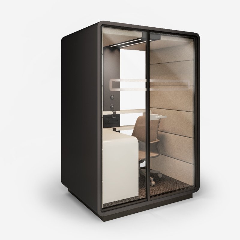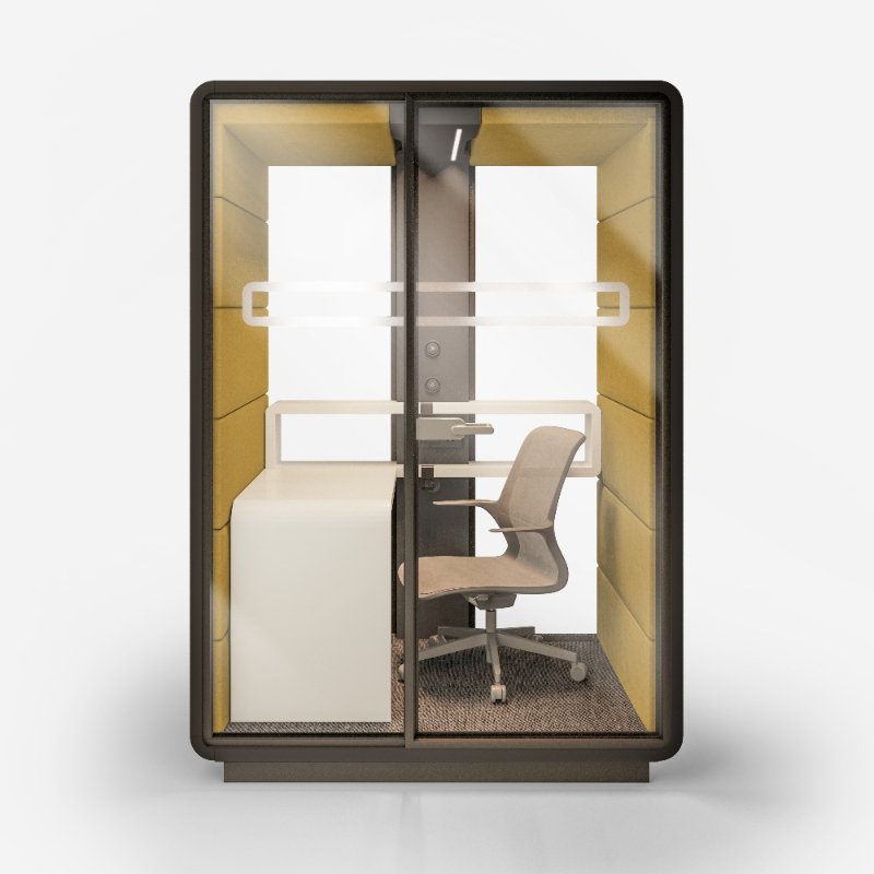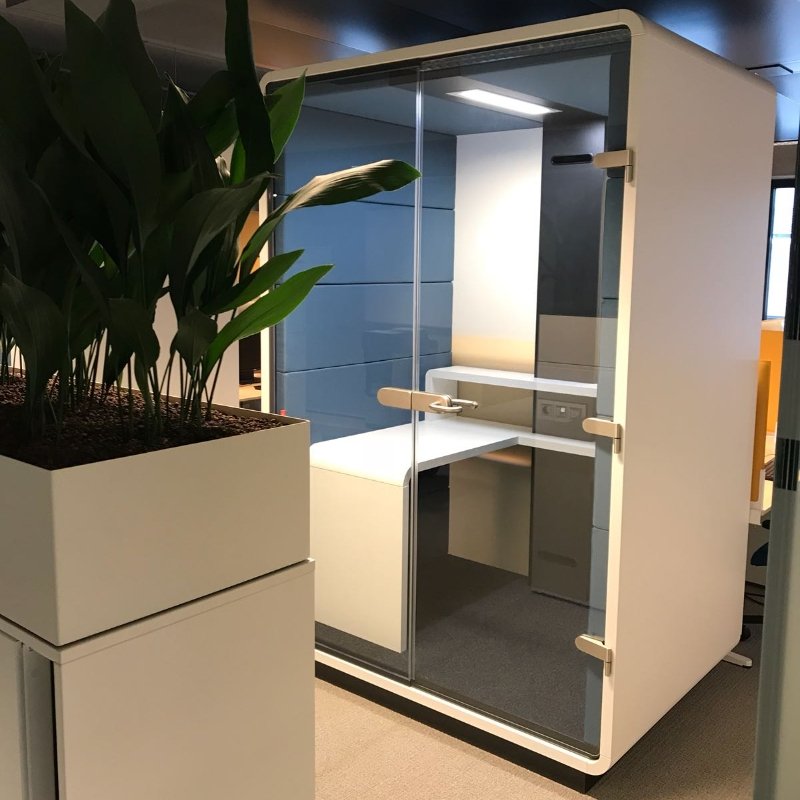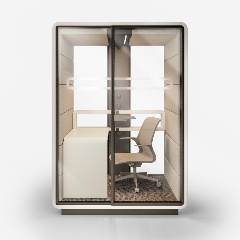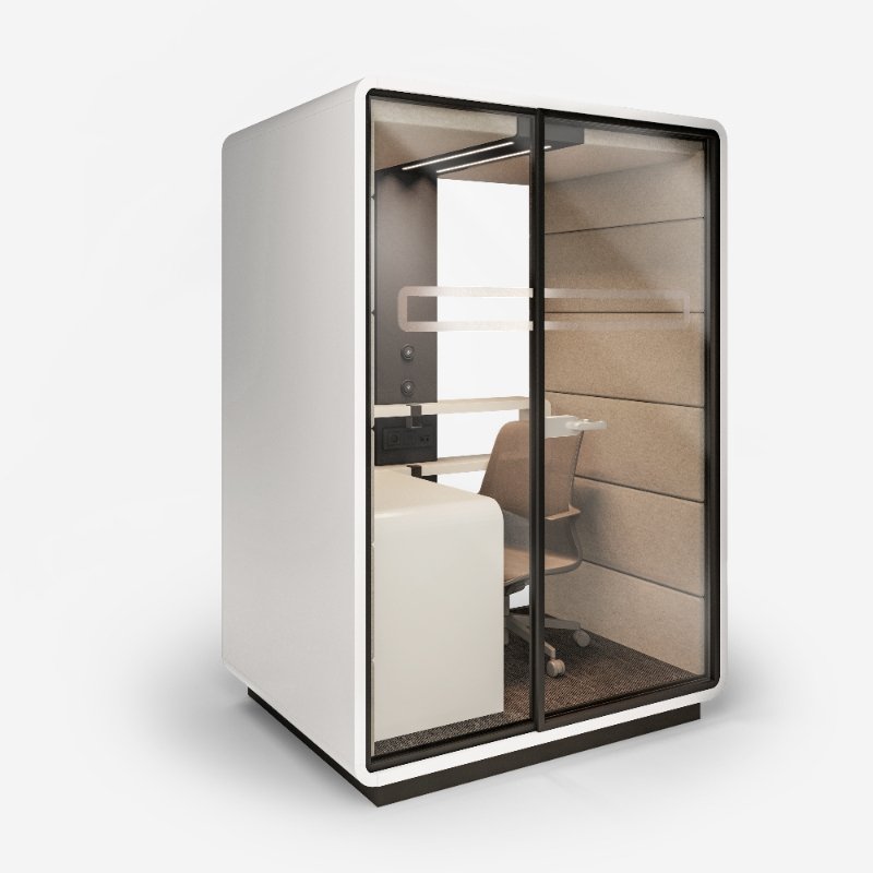 Akoestische werkplek HUSH Work, een afgesloten ruimte met superieure geluidsaborptie om effectief en ongestoord in te kunnen werken.