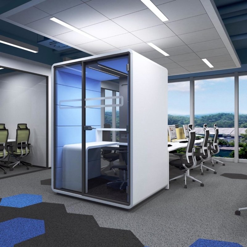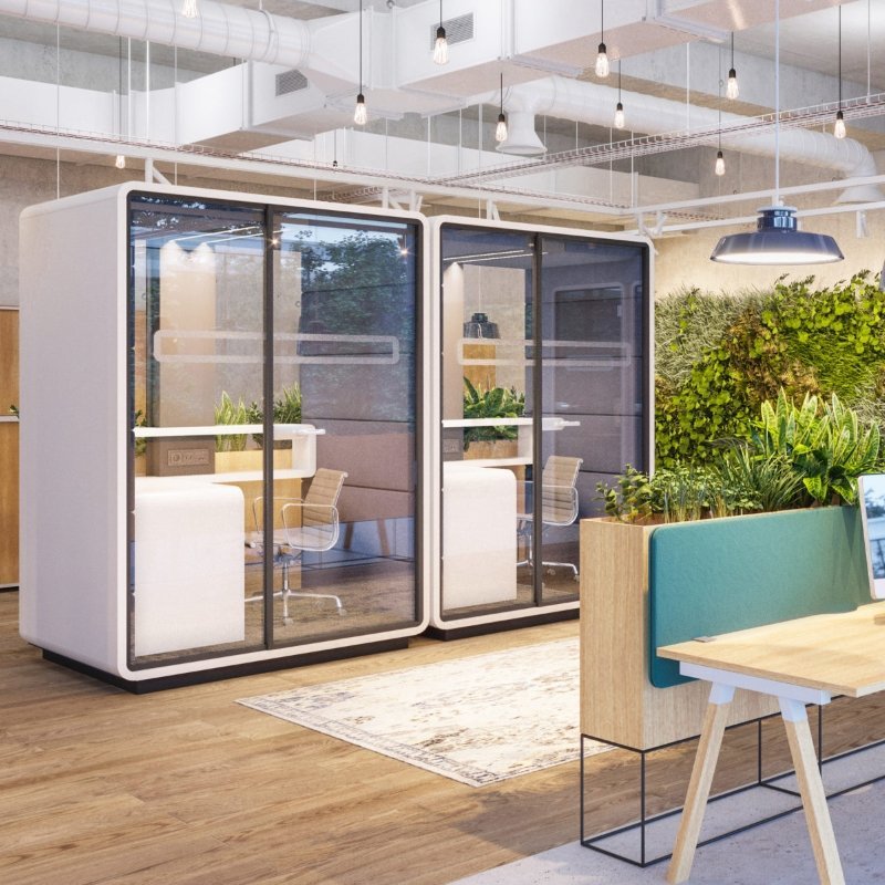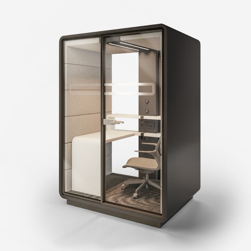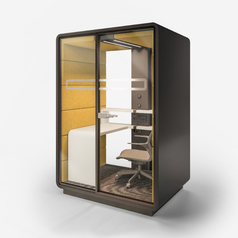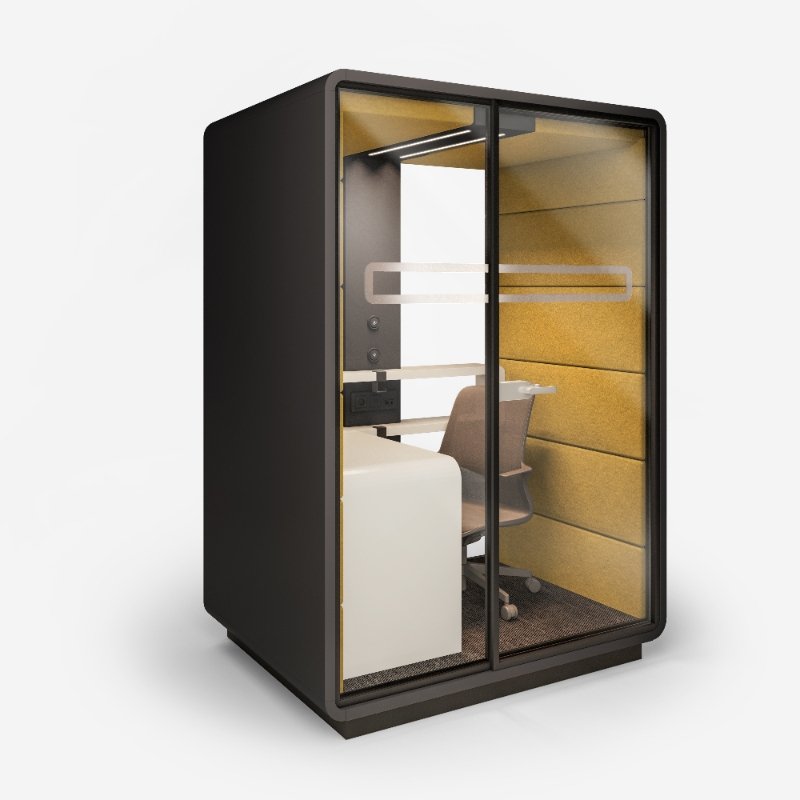 Akoestische werkplek HUSH Work, een afgesloten ruimte met superieure geluidsaborptie om effectief en ongestoord in te kunnen werken.