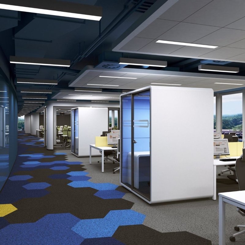 De geluidsabsorberende wanden van de werkpod zorgen voor goede een akoestiek en is perfect voor grote kantoortuinen en scholen.