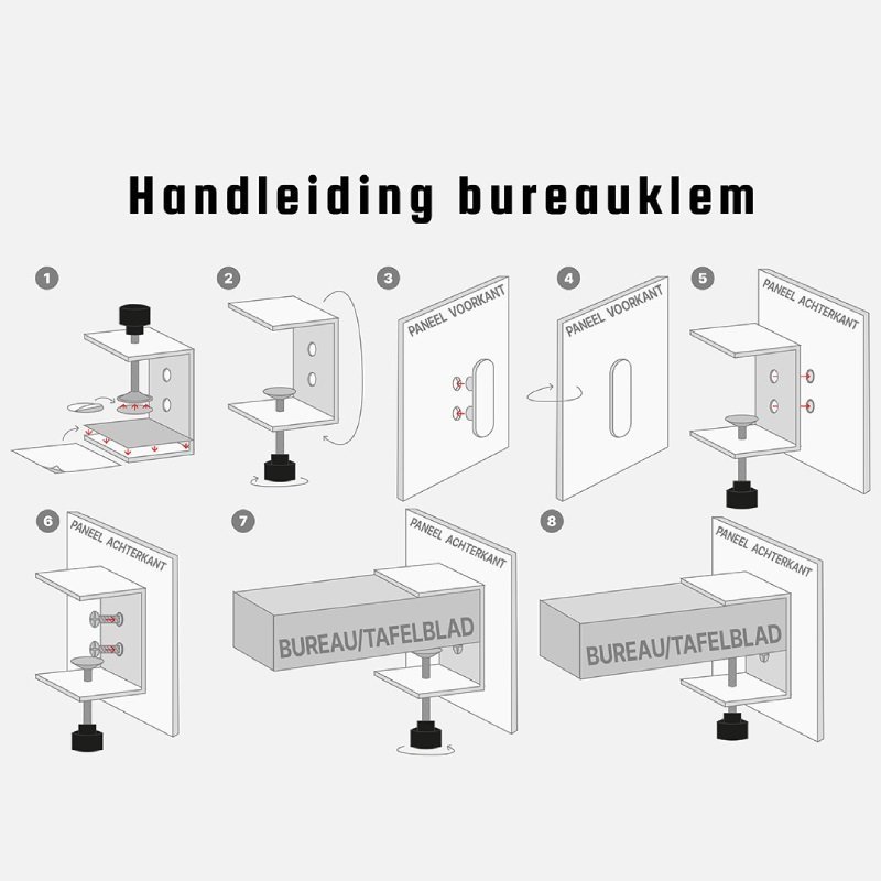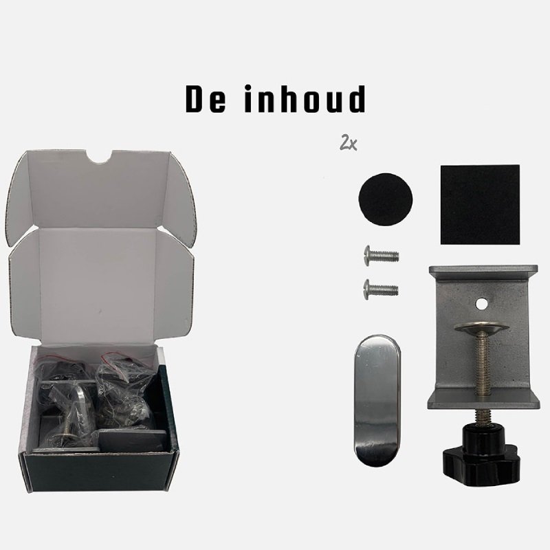 Het akoestische bureauscherm wordt standaard geleverd inclusief bureauklemmen, geschikt voor bladdikte van minimaal 1,6cm en maximaal 5,2cm.