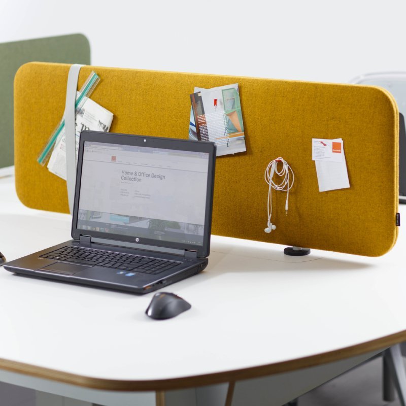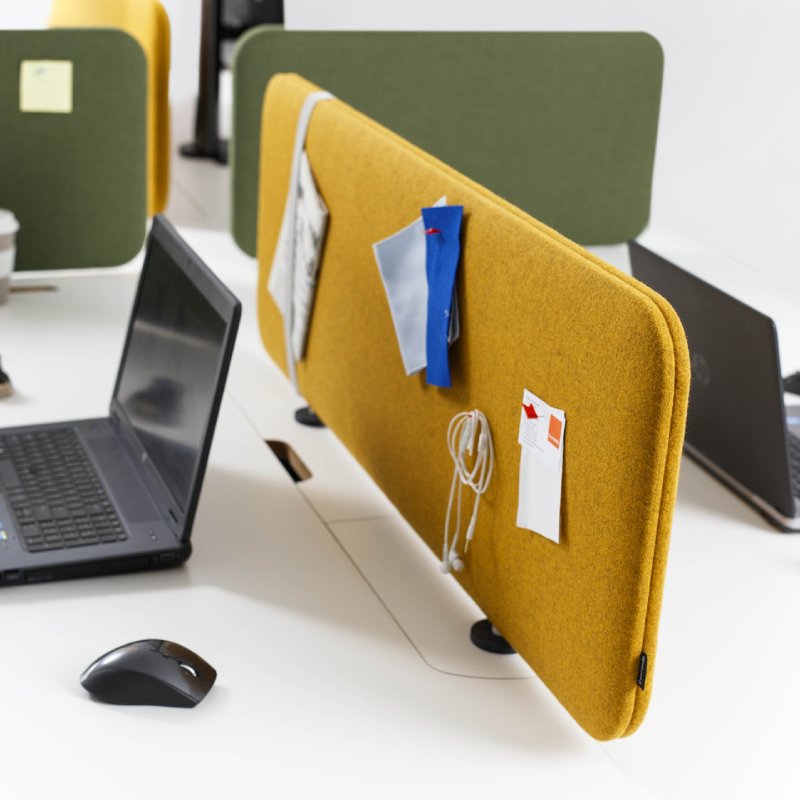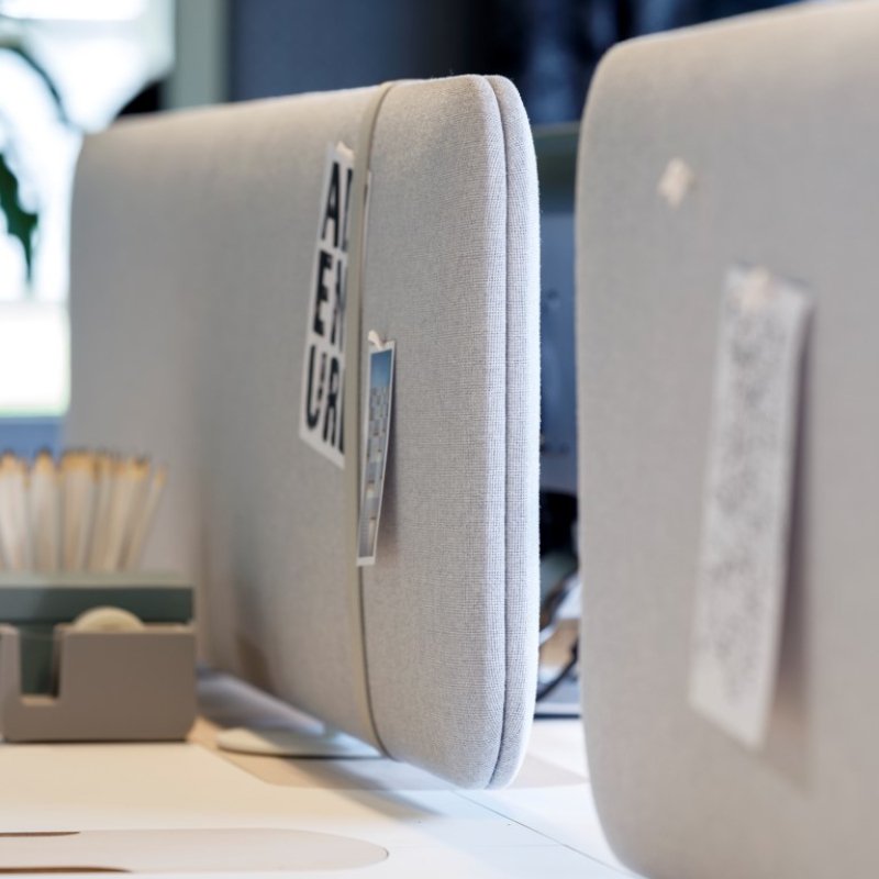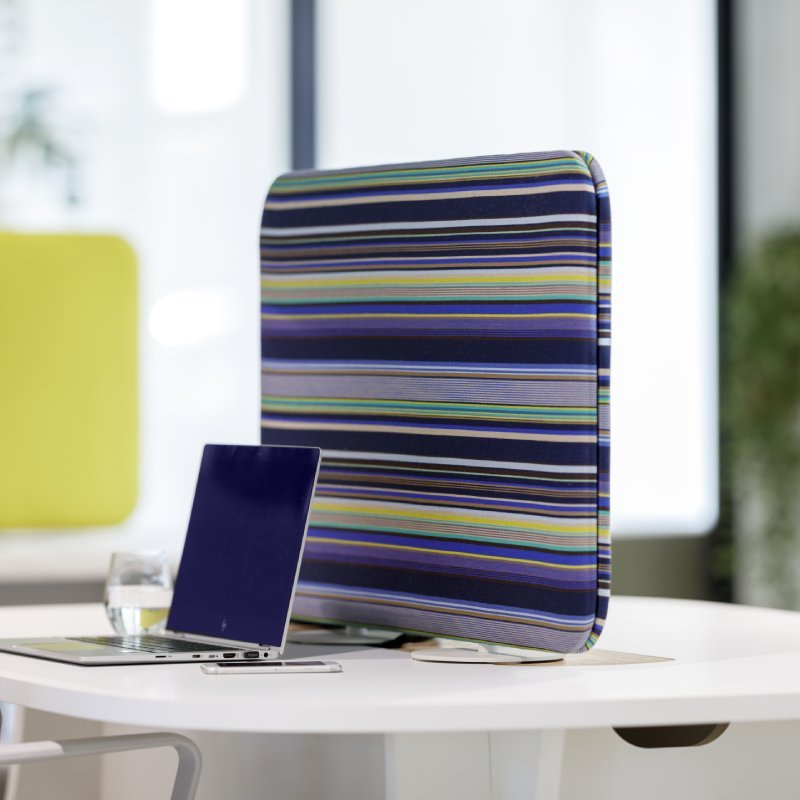 De akoestische bureauscheidingswand is gestoffeerd en leverbaar in diverse afmetingen, stofferingen en keuren. Op deze manier kunt u heel eenvoudig de uitstraling van het paneel bepalen, zodat het bij het interieur past.