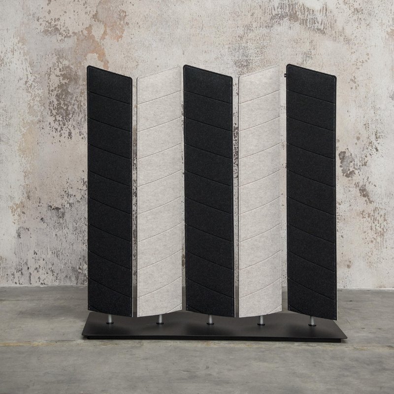 De BuzziBlinds zijn roteerbare ruimteverdelers met een akoestische werking. Deze moderne lamellen kunnen in een handomdraai een ruimte verdelen of juist ruimte creëren door ze te openen. Het scherm bestaat uit een metalen grondplaat met 5 gestoffeerde lamellen. De lamellen zijn mogelijk in vier verschillende vormen en diverse kleuren.