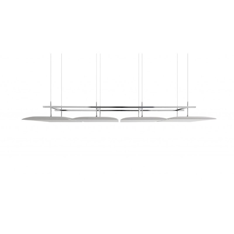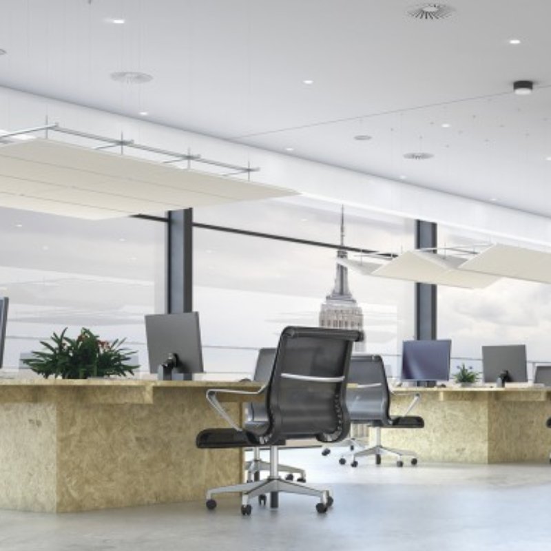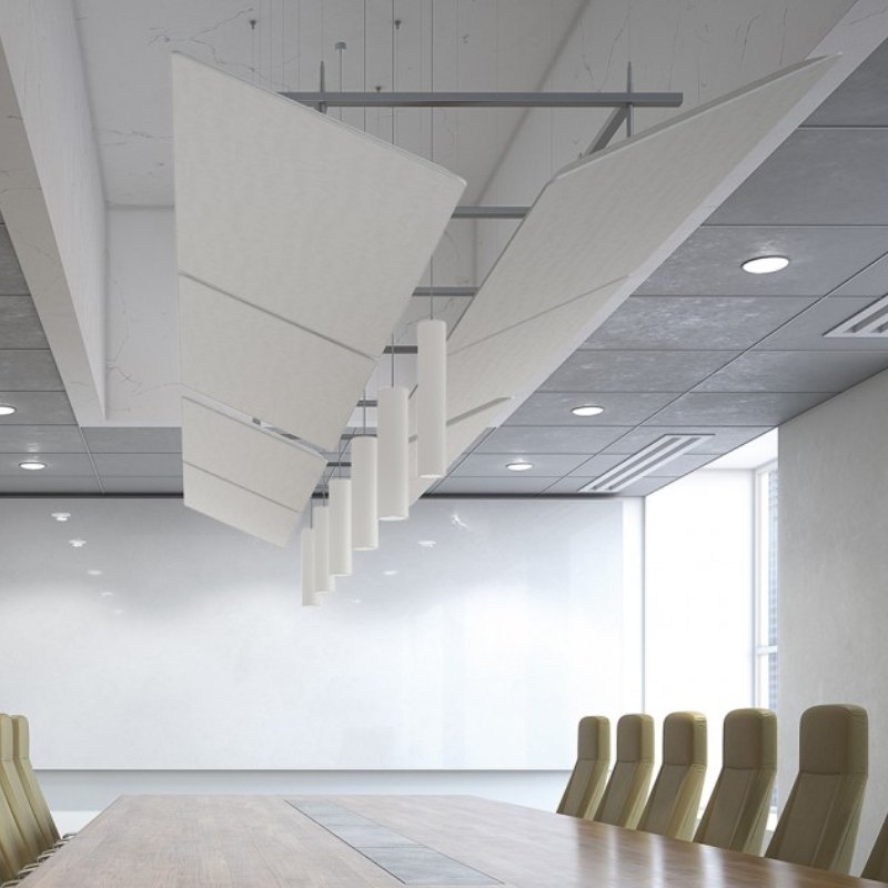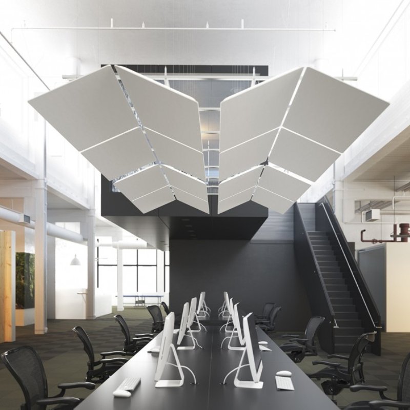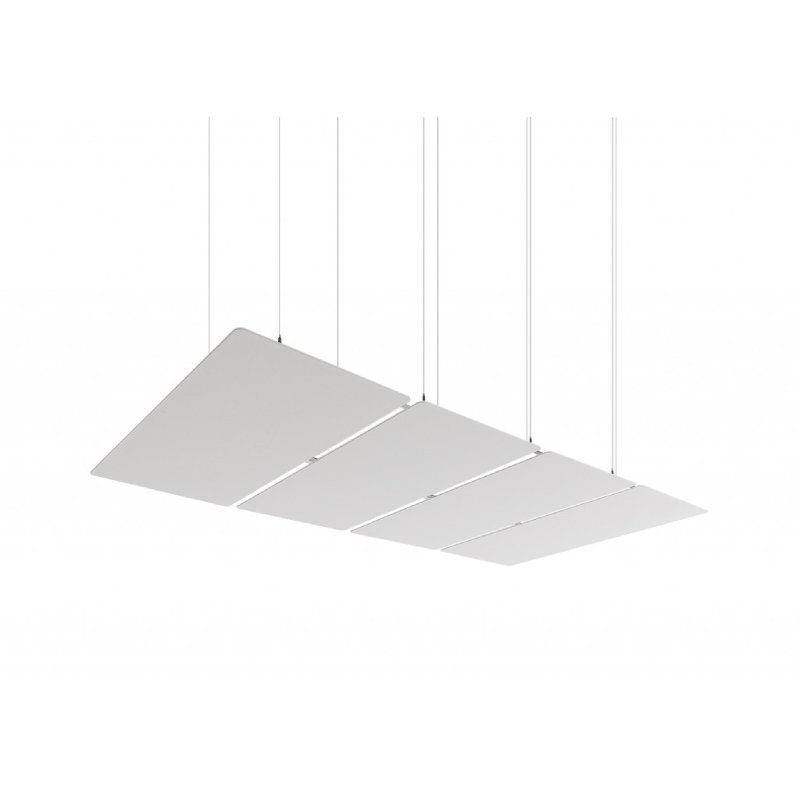Akoestisch plafondeiland Float, standaard in wit, is ideaal om geluiden te dempen boven werkplekken, vergadertafels en in ruimtes waar u een functionele plafondverlaging wilt toepassing met een groot oppervlak.