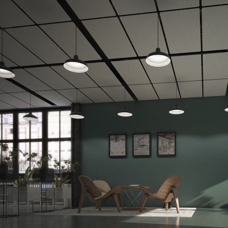 De akoestische panelen hangt van het plafond dat door middel van staalkabels aan gemonteerd kunnen worden. De 4 staalkabels (3,9m) van het geluidsabsorberend plafondpaneel kunnen op maat gemaakt worden.