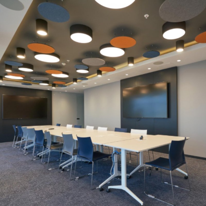 Combineer meerdere Flat Cloud panelen voor een speels geheel aan het plafond. Flat Cloud panelen zijn geschikt voor boven op werkplekken, vergadertafels of in congreszalen.