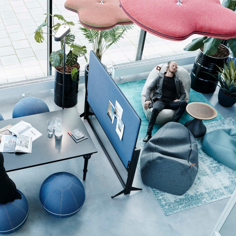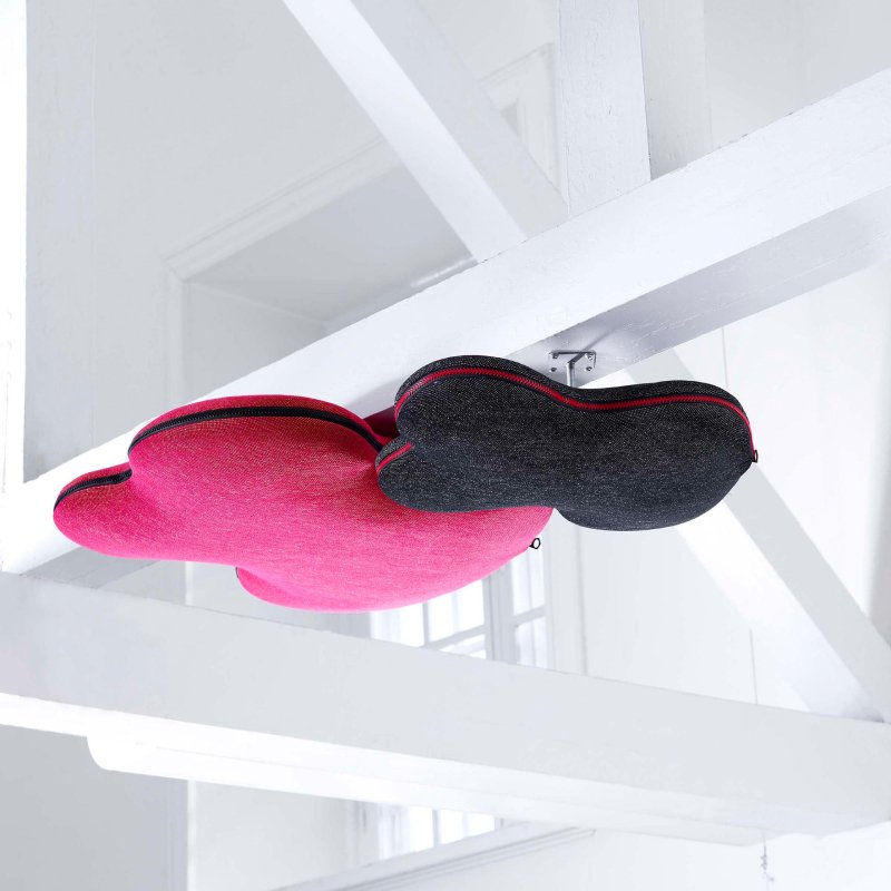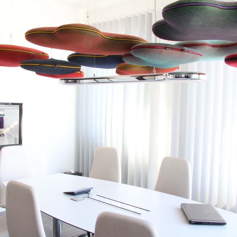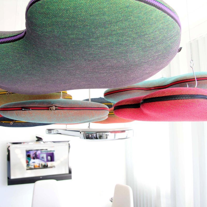 De wolken bestaan uit twee delen die aan elkaar bevestigd worden door middel van een rits. Een voordeel van Hang Over is dat ze bijdragen aan een betere akoestiek in een grote of open kantoortuin. Het geluiddempende paneel is mogelijk in diverse stoffen en kleuren. Zit uw gewenste kleur er niet tussen, laat het ons weten. Er zijn talloze stoffen en kleuren beschikbaar.
