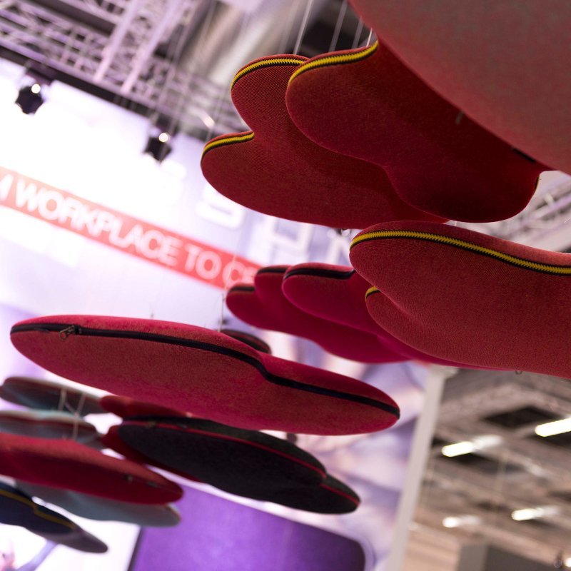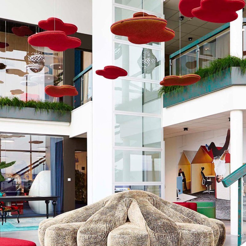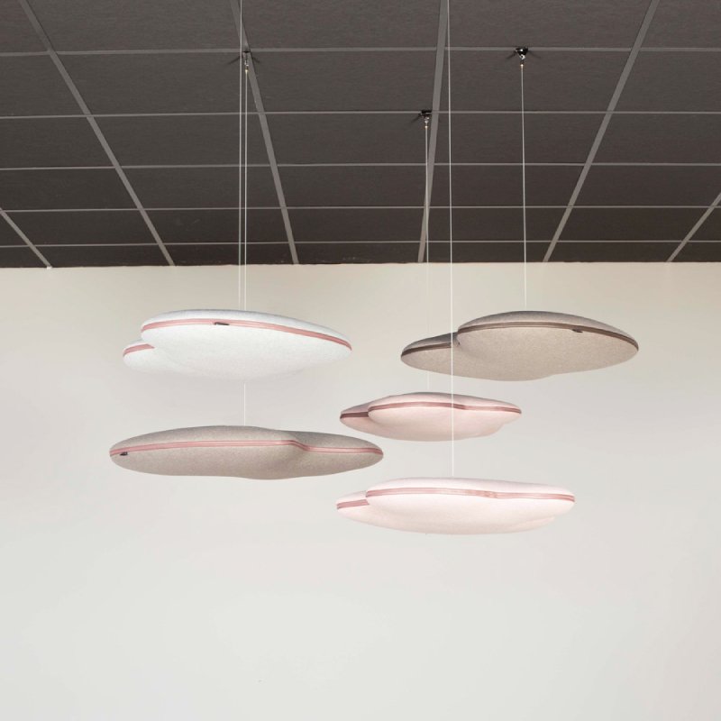 Akoestische paneel Hang Over is ontworpen in de vorm van een wolk en is beschikbaar in 2 verschillende formaten. De wolken zijn gevuld met A-gecertificeerd geluidsabsorberend materiaal en foam gelamineerde stof voor een uitstekende geluidsabsorptie.