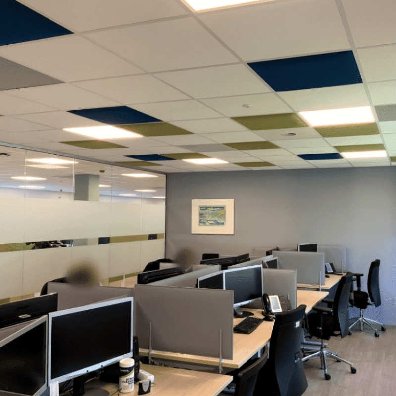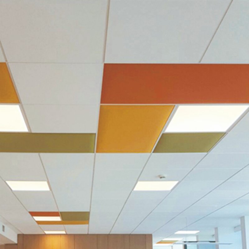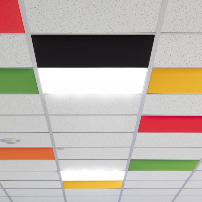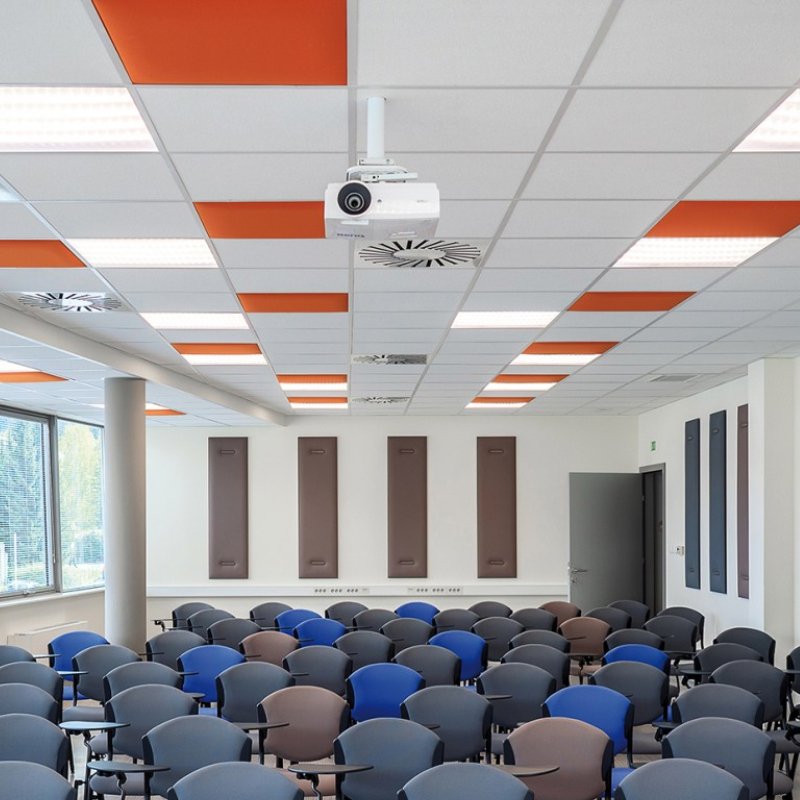 Akoestisch plafondpaneel In is een geluidsabsorberend paneel dat past in het bandraster van het systeemplafond. De akoestische panelen voldoen aan de bouwkundige eisen voor verlaagde plafonds. De In panelen zijn geschikt voor brandrastermaten van 60x60cm en 60x120cm.