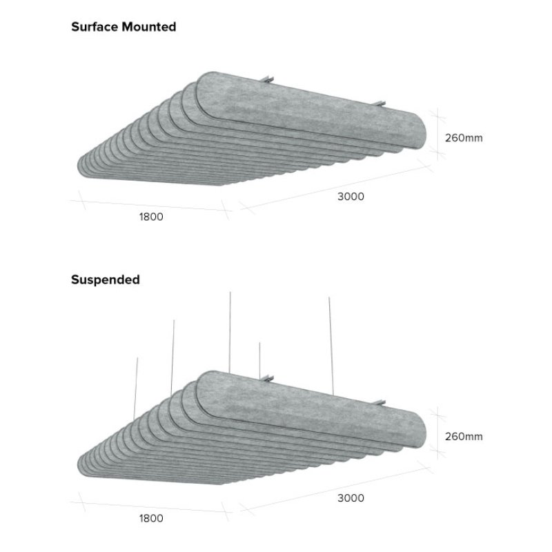 | Afmeting | Totale afmeting: 300cm breed x 80cm diep Afmeting 1 Baffle paneel: 180cm breed x 26cm hoog |