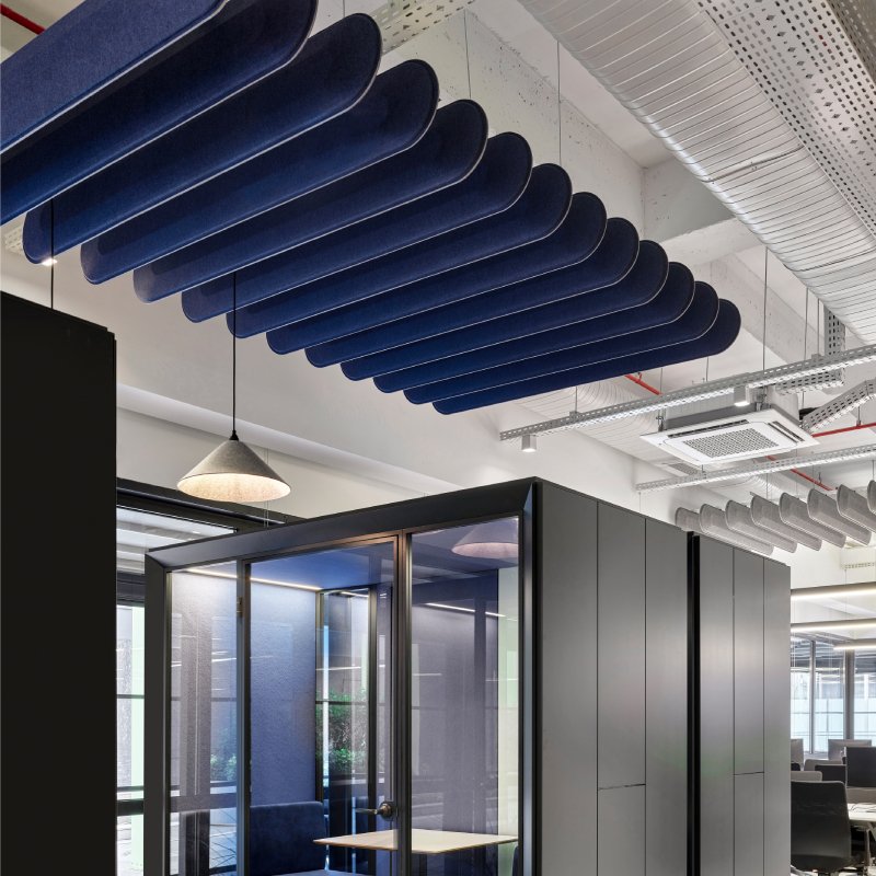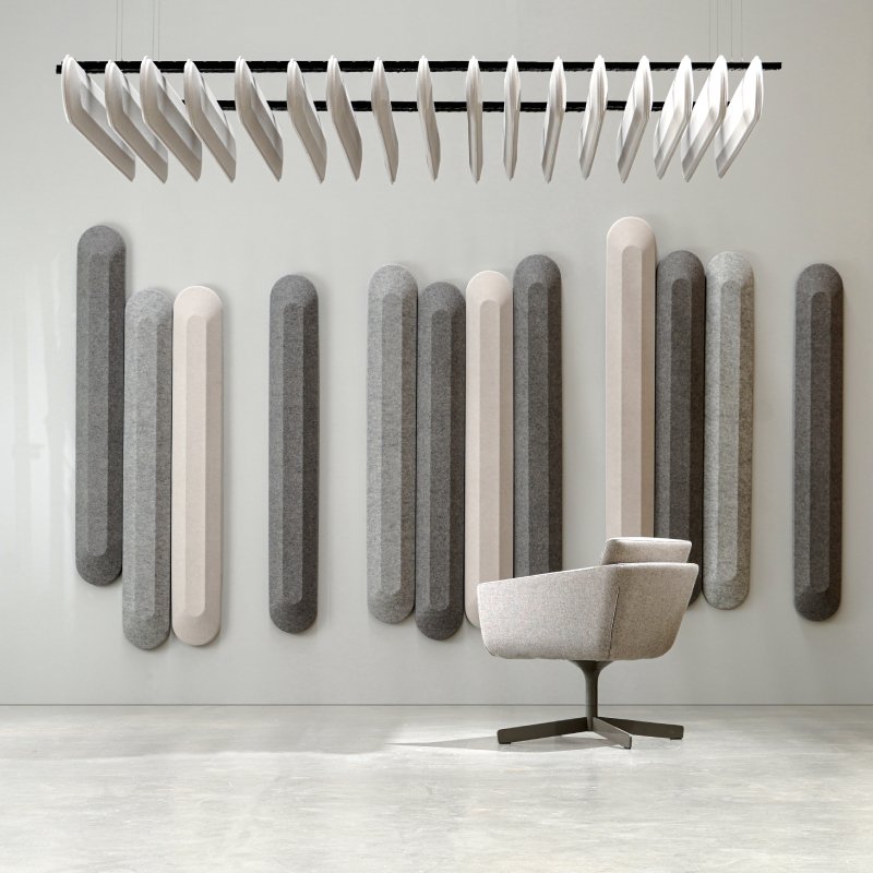 Akoestisch plafondpaneel Make Up Baffle komt uit de Make Up collectie van Feltouch. Het geluidsabsorberend paneel is mogelijk in verschillende patronen in diverse afmetingen. Kenmerkend aan de geluiddempende plafondpanelen is dat ze eenvoudig, elegant en één van de meest dynamische modulaire en akoestische plafondsystemen zijn. Plafondpaneel Baffles is eenvoudig te installeren, licht van gewicht en kan gemakkelijk grote oppervlakte van plafond bedekken.