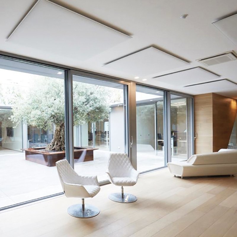 Het Oversize Ceiling systeem staat garant voor een hoge geluidsabsorptie, in het bijzonder voor de spraakfrequenties. De afwerking zorgt ervoor dat 100% van het oppervlak geluidsabsorberend is aan beide zijden. De akoestische hangpanelen worden vaak ingezet in grote kantoortuinen. De geluiddempende werking is uitvoerig getest en aangetoond in het laboratorium voor akoestiek verbonden aan de universiteit van Ferrara in Italië.