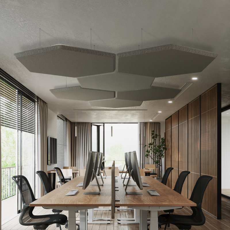 Met deze geluiddempende hangpanelen creëer je een leuke grafische kunst aan het plafond die tegelijkertijd de akoestiek in de ruimte optimaliseert. De 3D plafondpanelen dempen het geluid in de ruimte, wat resulteert in betere concentratie en meer rust.