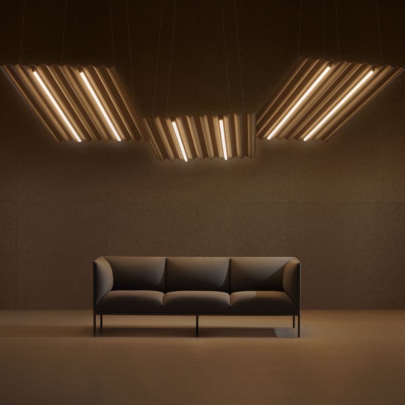 U kunt het hangende paneel ook met (dimbare) verlichting kiezen. In dat geval is het geluidsabsorberende paneel in het midden voorzien van lichtbron die in de lengte van het paneel loopt. (22W, 220 - 240V, 50 / 60 Hz, 2090 lumen)