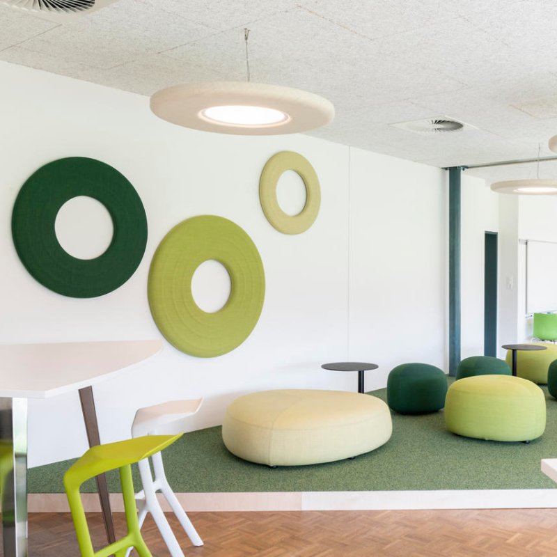 De Buzzidonut is een speels akoestisch wandpaneel met een geluiddempende werking. Het wandpaneel in de vorm van een donut wordt aan de muur bevestigd door middel van twee metalen beugels. BuzziDonut is verkrijgbaar in een reguliere platte versie en met 3D structuur in verschillende patronen. Het akoestische paneel wordt gestoffeerd en is leverbaar in diverse kleuren en drie afmetingen.