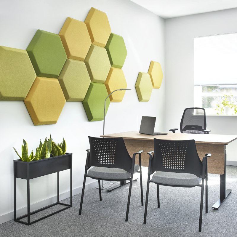 Door meerdere panelen te gebruiken in verschillende kleuren en afmetingen, creëer je een leuke grafische kunst aan de muur die tegelijkertijd de akoestiek in de ruimte optimaliseert. Silent Block muurpanelen dempen het geluid op kantoor wat resulteert in betere concentratie en meer rust.