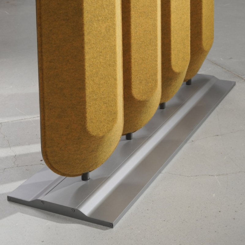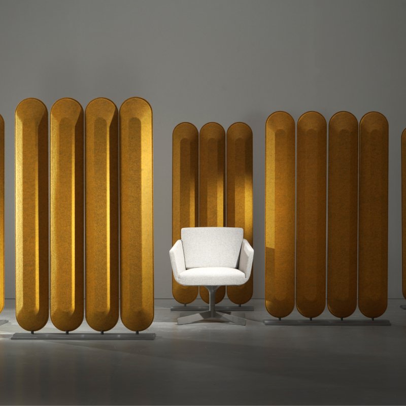 Het oppervlakte van de staande akoestische scheidingswand geeft het product een luxueuze uitstraling. De geluiddempende panelen zijn mogelijk in een standaard uitvoering in naturel kleuren of met de Mandarin stoffering in diverse kleuren aan de voorzijde en achterzijde van de akoestische totems.