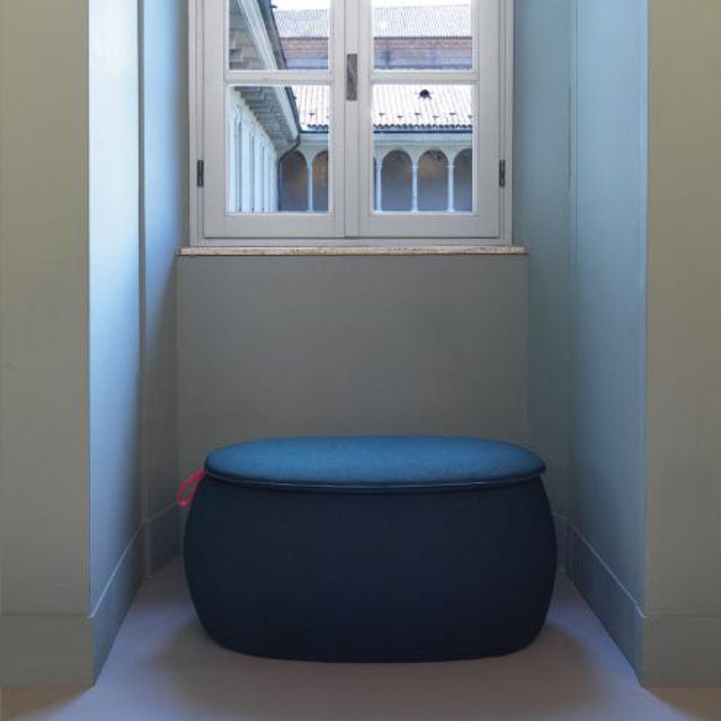 Snowpouf is leverbaar in diverse mooie kleuren. Het rode stoffen lint kan worden gebruikt om de poef gemakkelijk te verplaatsen.