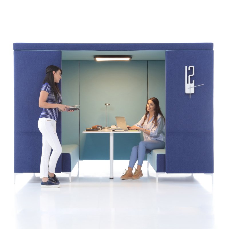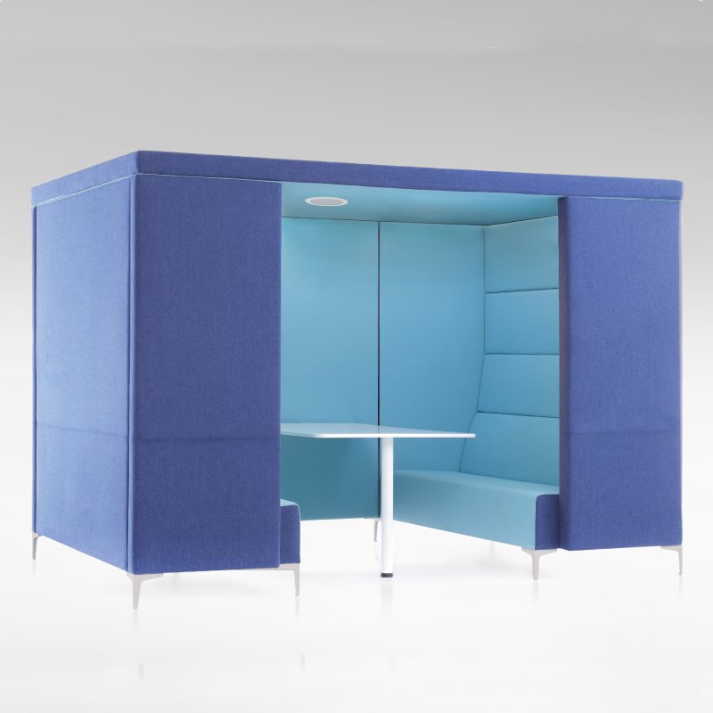 Dit model is uitgevoerd met hoge panelen en een dakelement. De overlegplek biedt een akoestische oplossing voor op kantoor als u rustige werkplekken zoekt in een open ruimte.