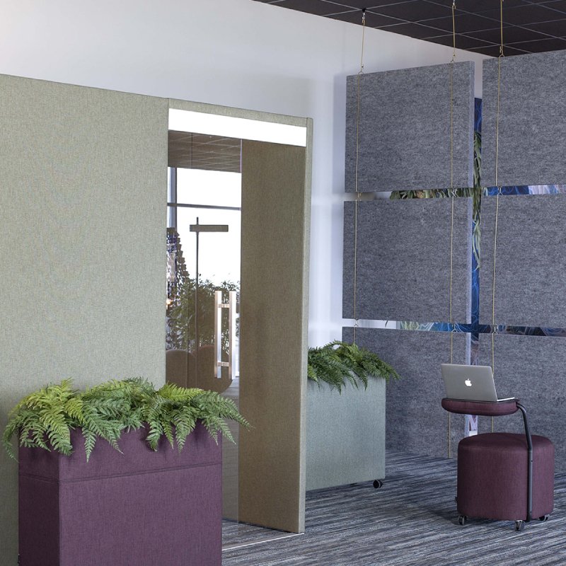 De geluiddempende room divider is rondom gestoffeerd en is voorzien van (geremde) wielen. De plantenbak is voorzien van 3cm dik geluidsabsorberend materiaal wat bijdraagt aan een prettige akoestiek op de werkvloer.