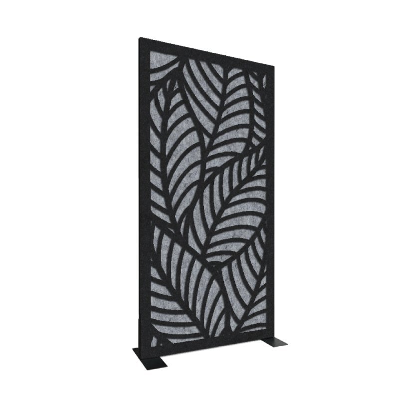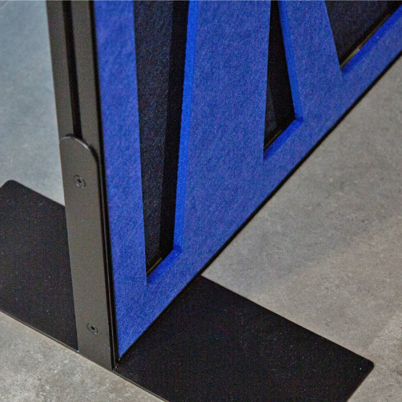 Het vrijstaande privacy scherm wordt geleverd met een zwart aluminium frame en voeten. Kies uit diverse kleuren en bijzondere ontwerpen en stijl jouw eigen staande akoestische ruimteverdeler samen. Heb je zelf een ontwerp in gedachte? Bel of mail ons om de mogelijkheden te bespreken!