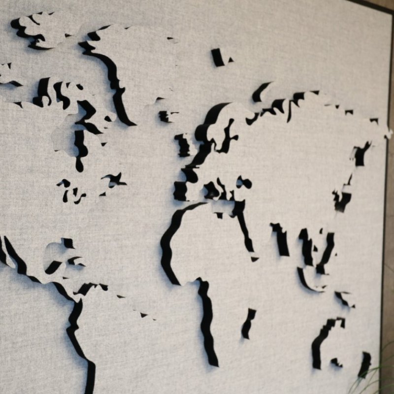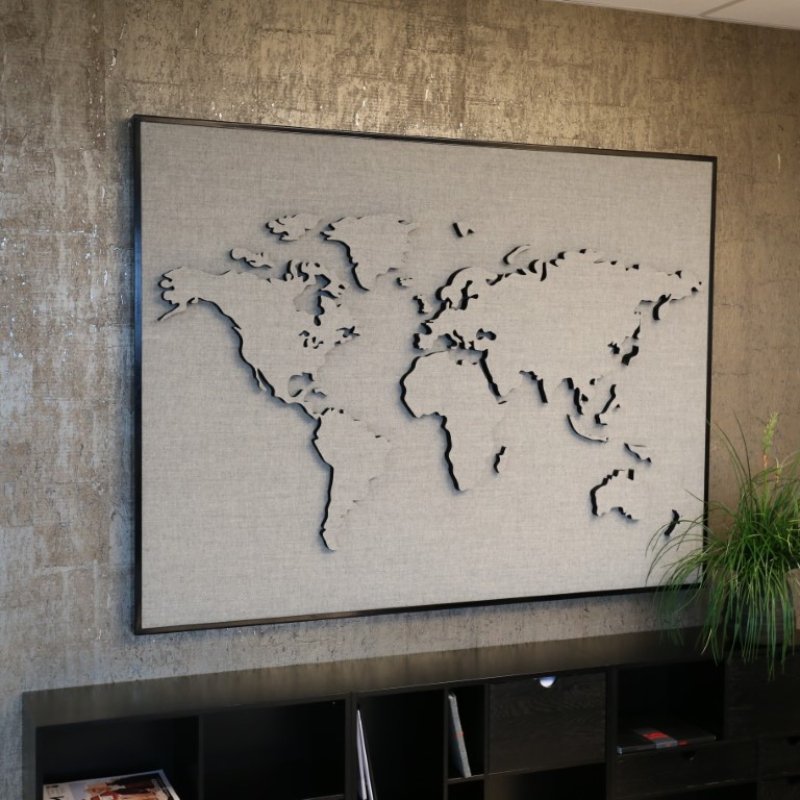 De akoestische wereldkaart is een echte blikvanger voor aan de muur en vrolijkt elke ruimte op. Je kunt de kaart in diverse kleuren kiezen, zodat deze bij de inrichting op kantoor past. Het is goed om te weten dat alleen de voorzijde van de 3D print gestoffeerd is. De zijkanten hebben de kleur van het gekozen kernmateriaal.