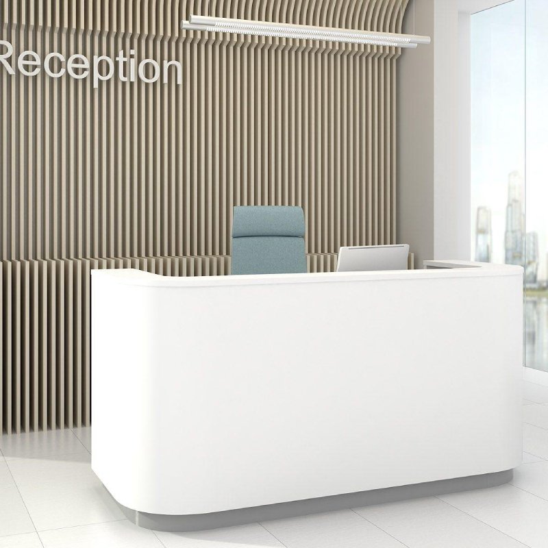 Deze compacte balie met afgeronde hoeken zorgt voor een mooi en warm welkom. Cosy is leverbaar in de kleur wit.