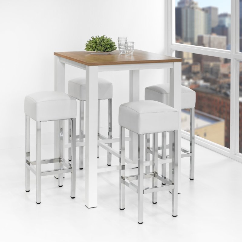 Combineer de vierkante bartafel met barkrukken of gebruik de tafel als statafel en laat de hoge krukken achterwege.
