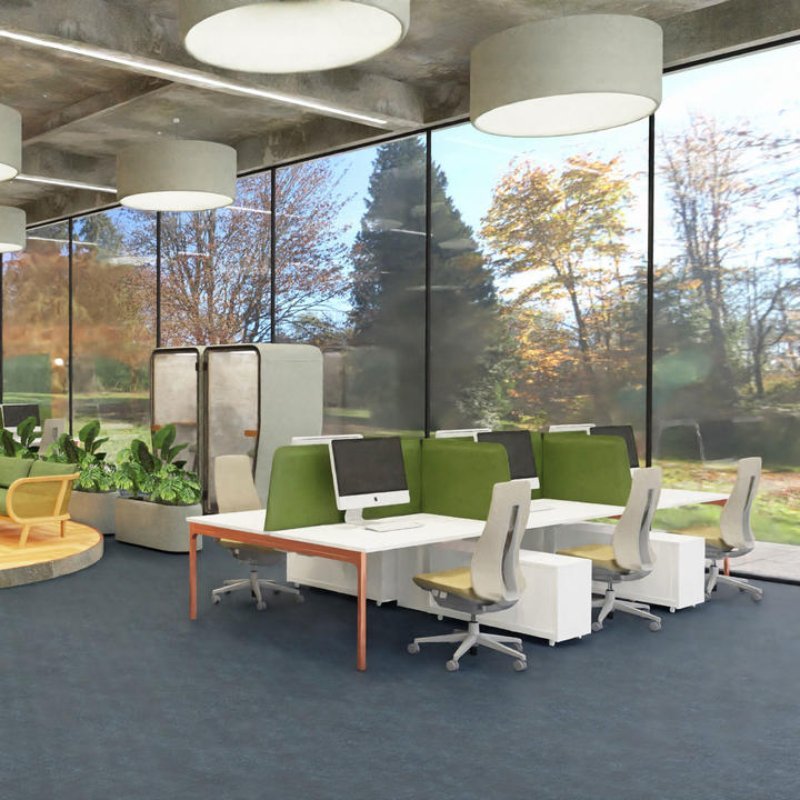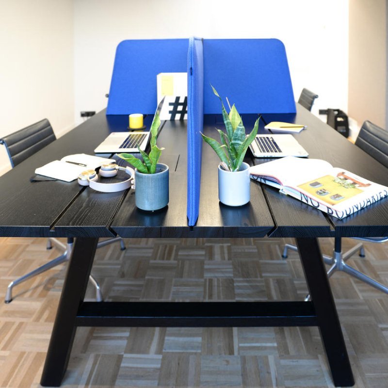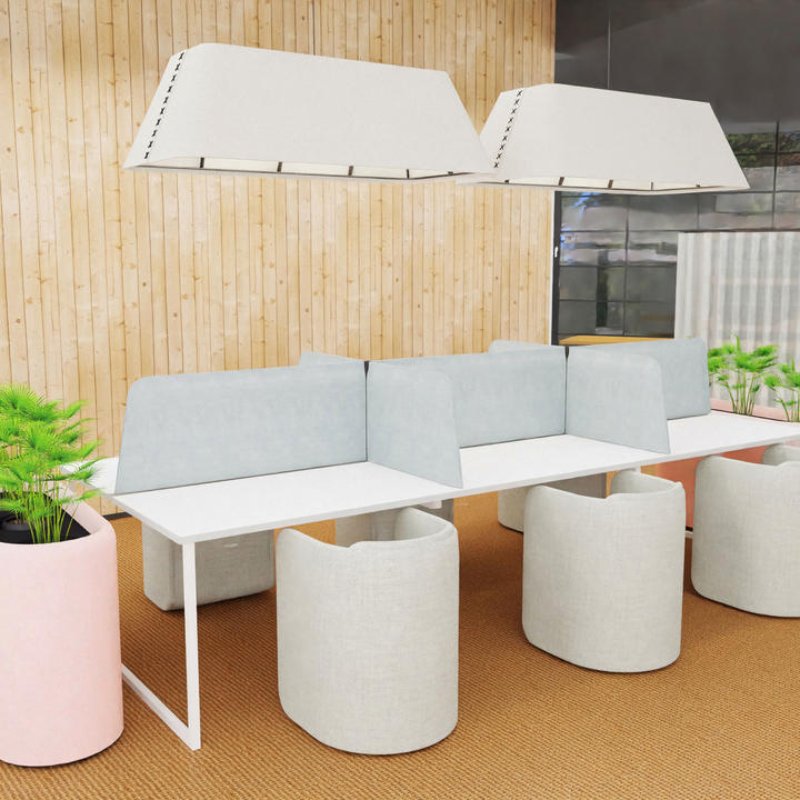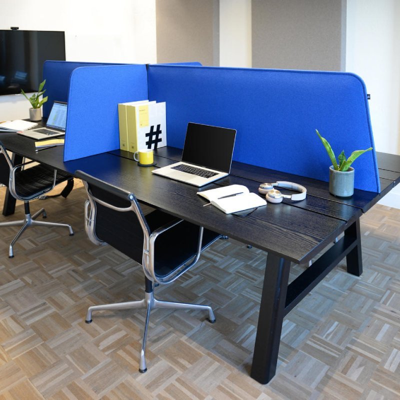 BuzziDesk Cross is een akoestisch bureauscherm die gemakkelijk een groot werkblad opdeelt in verschillende werkplekken. Deze schermen creëren privacy en een stille werkplek door de geluiddempende functie.