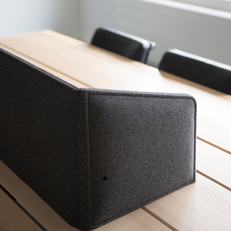 Het akoestisch scherm is verkrijgbaar in twee hoogtes: 35cm en 50cm. De vouwbare zijkanten hebben een lengte van 37,5cm of 50 cm. Het middendeel kan variëren van 80cm tot 200cm. Het scherm is mogelijk in diverse kleuren.