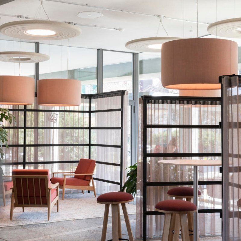 BuzziJet laat geluid heen en weer bewegen in de grote cilinder en draagt hierdoor bij aan een prettige akoestiek. Ideaal voor boven uw bureau, receptie of vergadertafel. Het simplistische design geeft een serene uitstraling, de akoestische werking doet de rest.