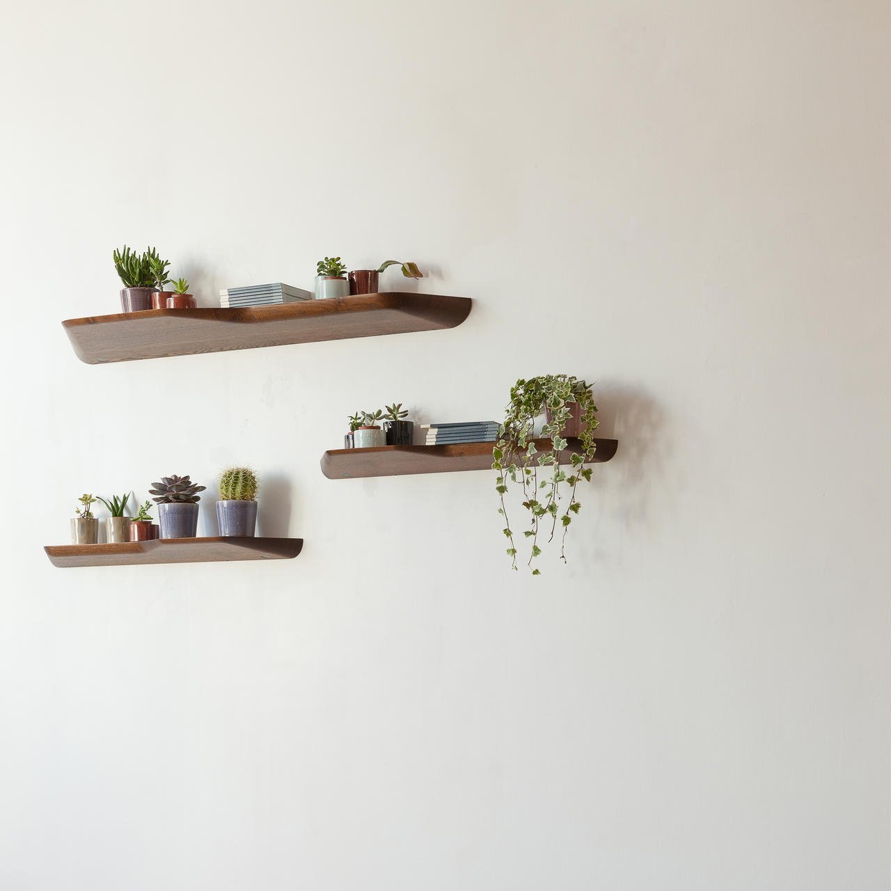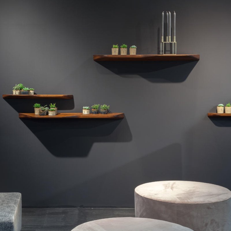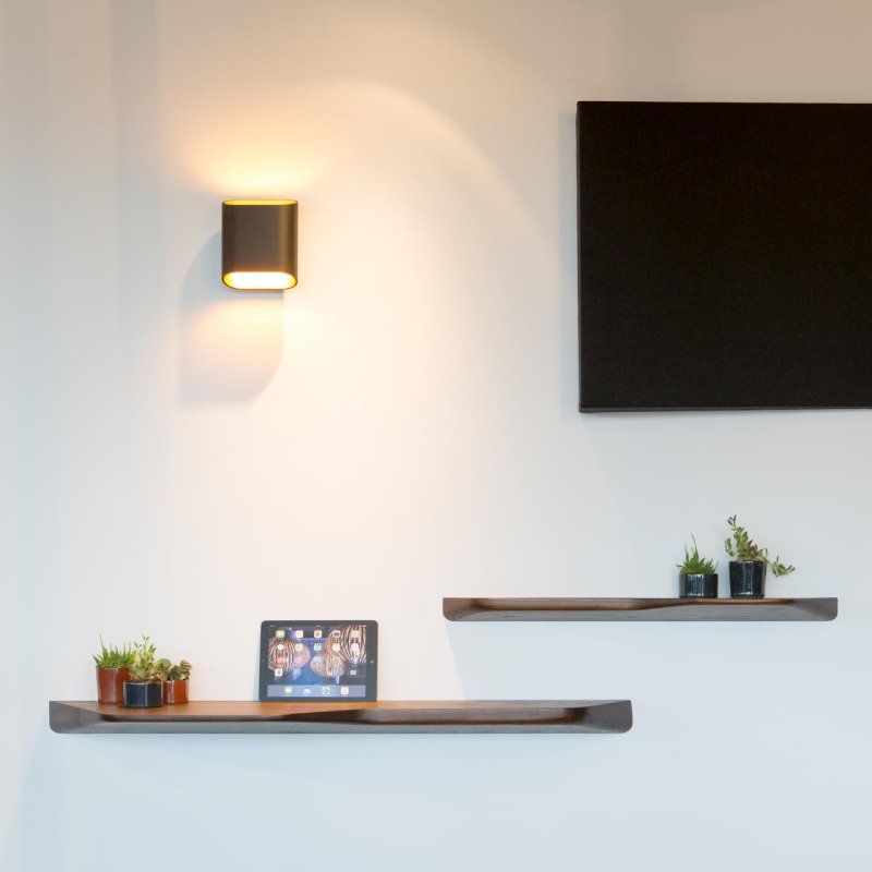 BuzziPlank is een zwevende wandplank die uit massief hout is gesneden. De plank hangt aan de muur, waar die zowel gasten thuis als op het kantoor begroet.