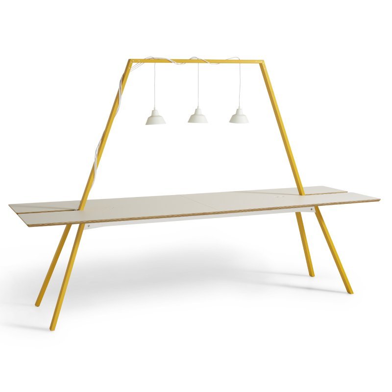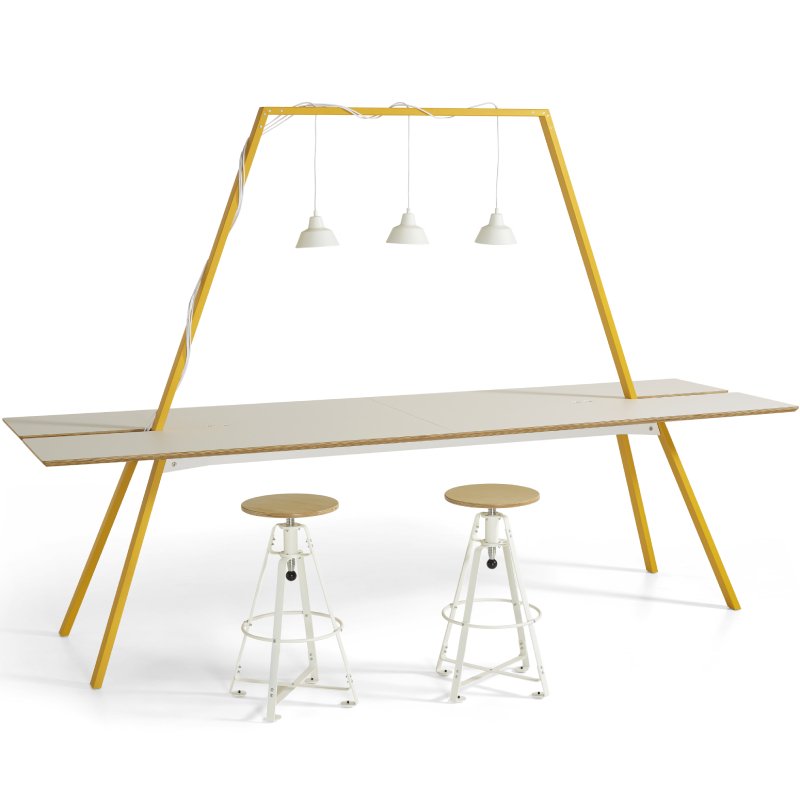 Zoals de naam al doet vermoeden is de tafel geïnspireerd op een aanlegsteiger. Dit is ook precies de functie die de tafel binnen kantoor heeft. Een plek waar mensen 'aanmeren', samen komen en overleggen. Het metalen frame van de tafel loopt door boven de tafel waar lampen aan gehangen kunnen worden. De combinatie van het frame en de lampen zorgen voor een intieme sfeer.