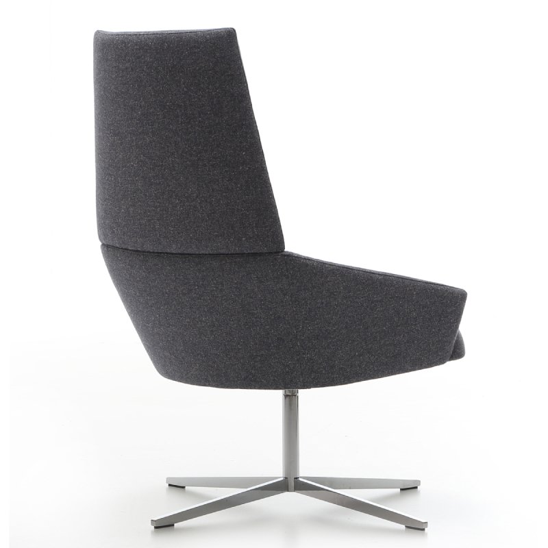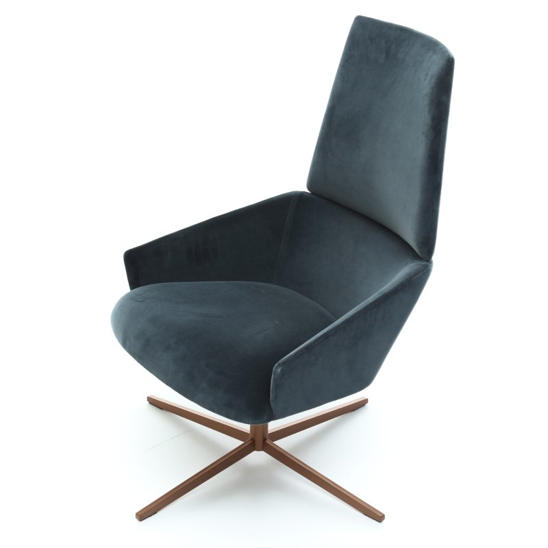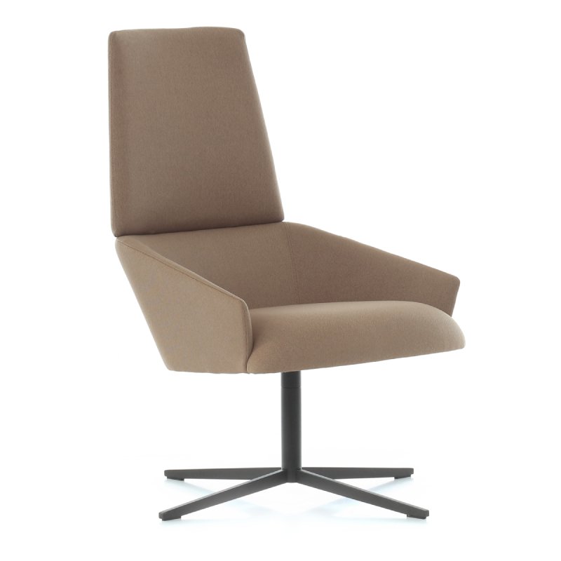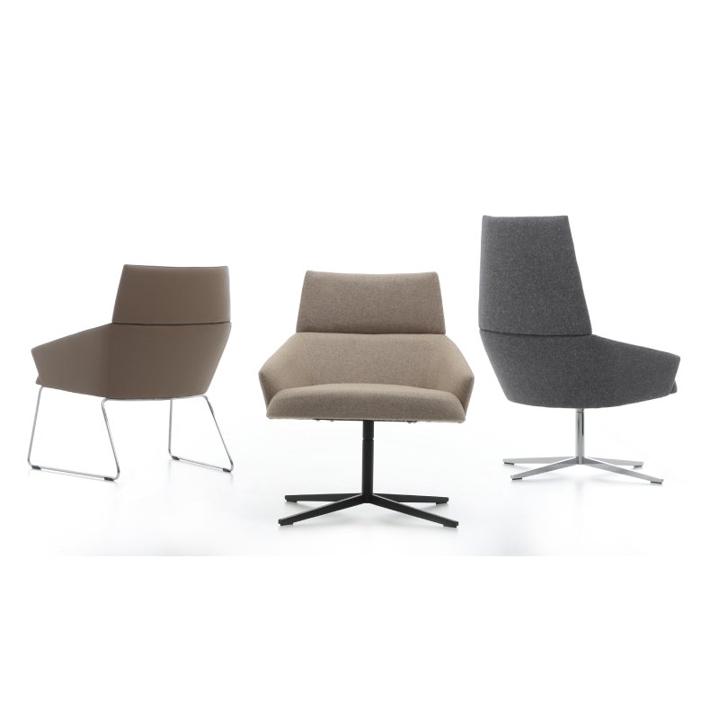 Wall street, een dynamische, ruime en comfortabele fauteuil. De comfortabele loungestoel is leverbaar met een lage rug of met een hoge rug. Het onderstel van de luxe stoel kan geleverd worden met een sledeframe van draadstaal of met een draaibare 4-teens kruisvoet.