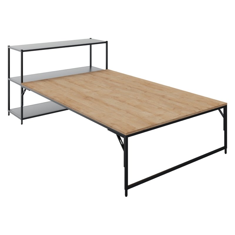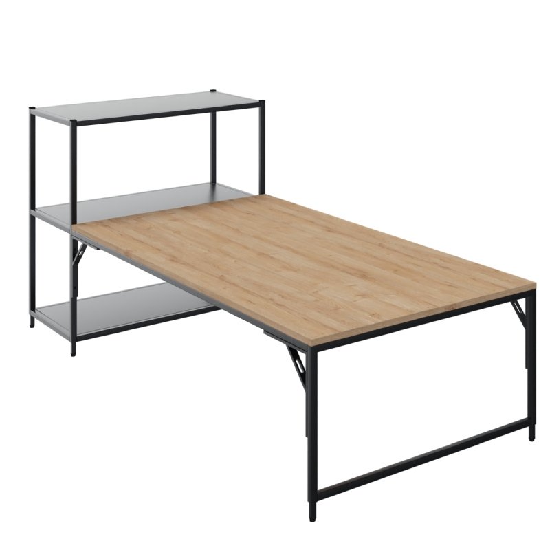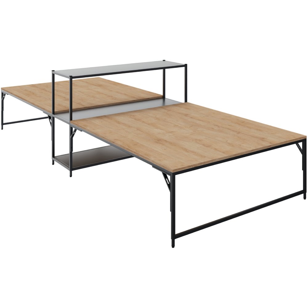 Deze Flexwall met lage aanbouwtafel is een handige en stijlvolle manier om een zithoek in bijvoorbeeld een ontvangstruimte te creëren met opbergruimte. Deze vakkenkast bestaat uit een metalen frame met legborden en daaraan bevestigd een tafel van 46cm hoog.