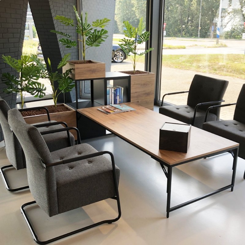 Combineer de multifunctionele opstelling met loungestoelen/fauteuils voor een comfortabele zitplek voor bezoekers of collega’s.