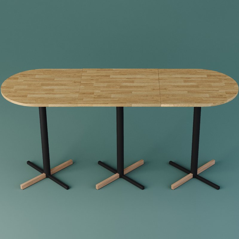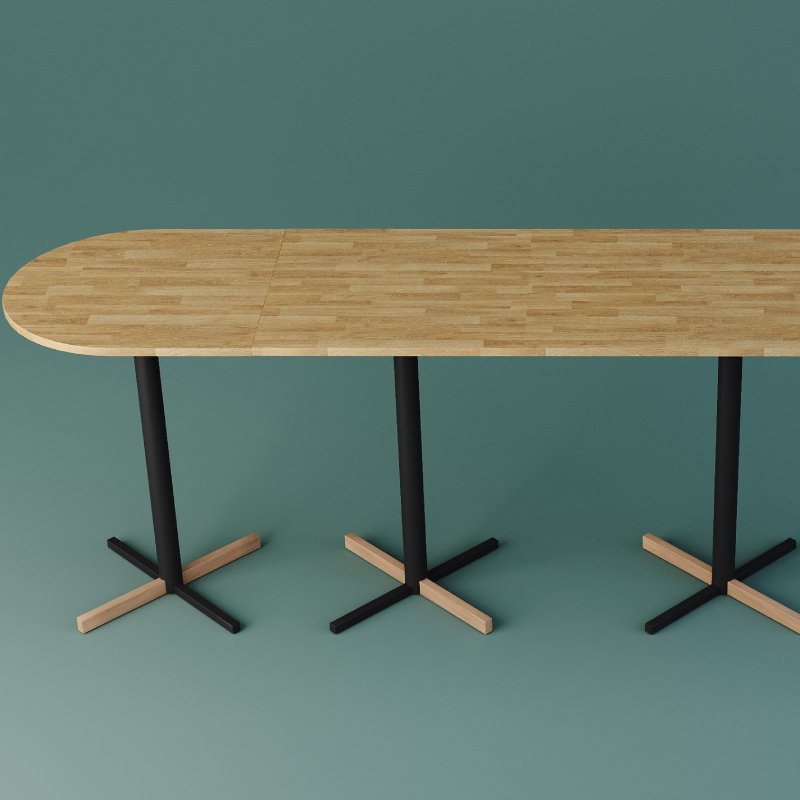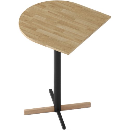 Hoge halfronde kolomtafel Cross komt uit een collectie van industriële tafels met een karakteristieke metalen kruispoot dat gedeeltelijk van massief eiken hout gemaakt kan worden.