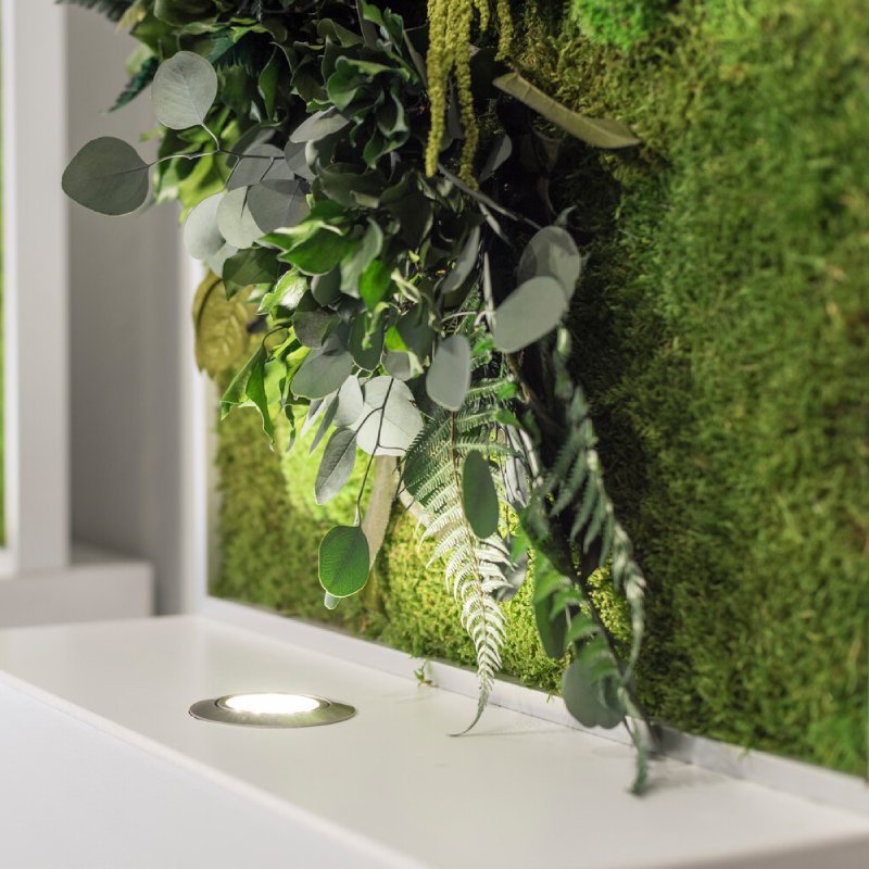 De vegetatie bestaat uit 100% echt, natuurlijk bewaard gebleven mos en planten. De mos die gebruikt wordt voor de mospanelen, worden op gecertificeerde boerderijen gekweekt en gecultiveerd. Door natuurlijke conservering worden de planten permanent mooi gehouden. De mospanelen hebben 0% zorg of verlichting nodig en blijven altijd groen.