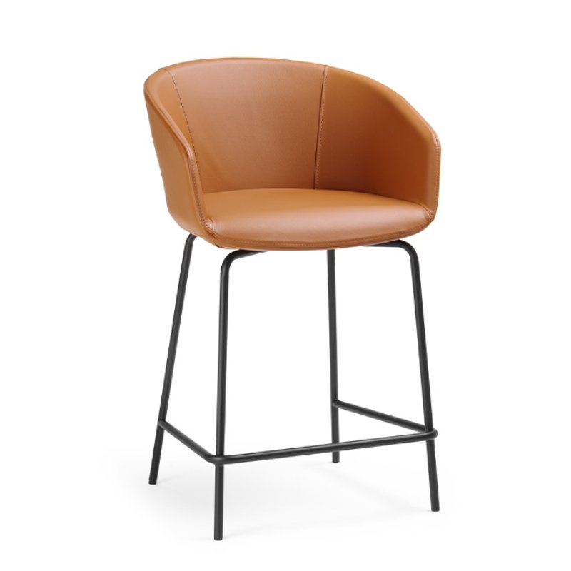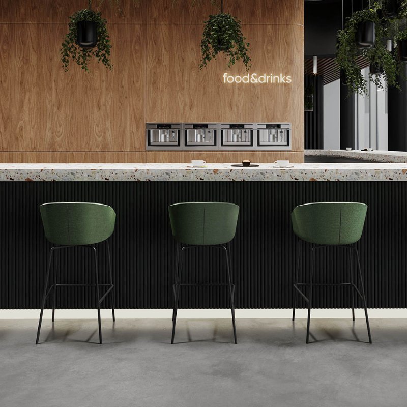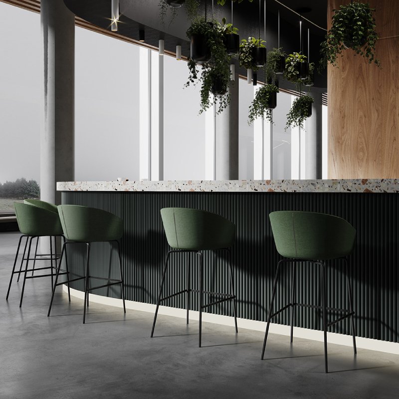 De barstoel heeft een stalen 4-poot frame met voetensteun. Zowel de stoffering als het onderstel zijn mogelijk in diverse kleuren.