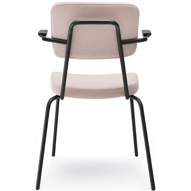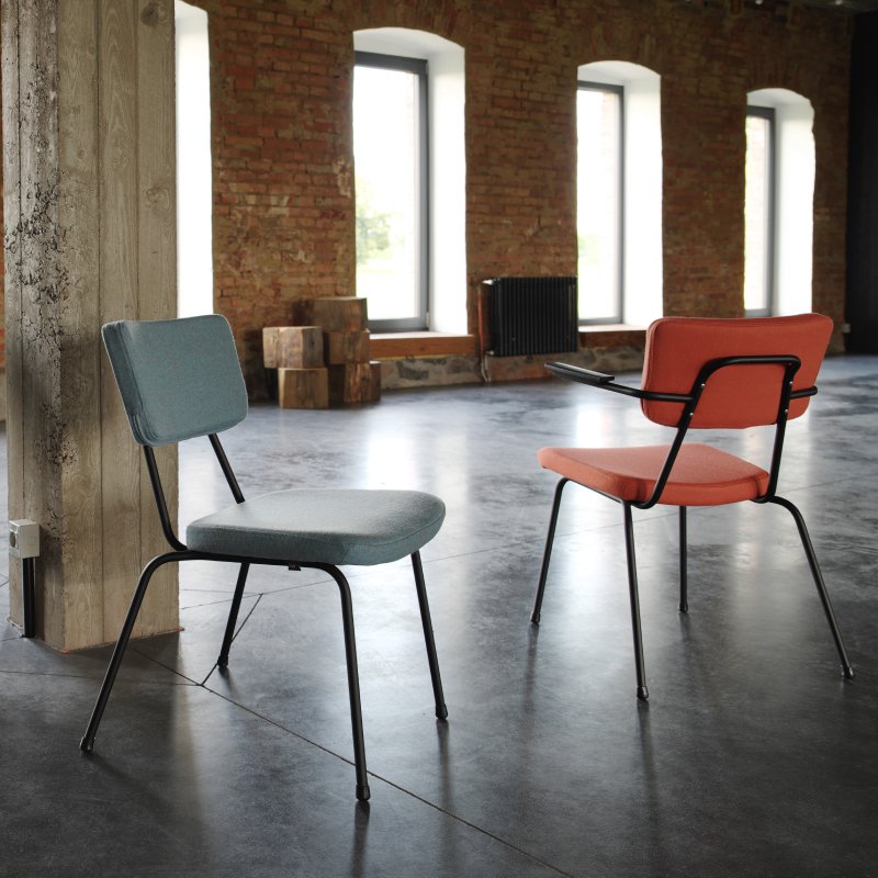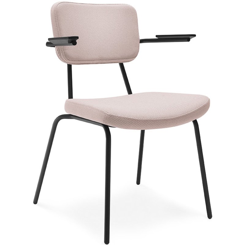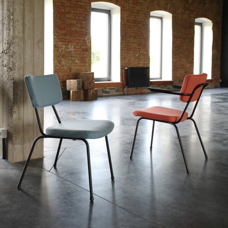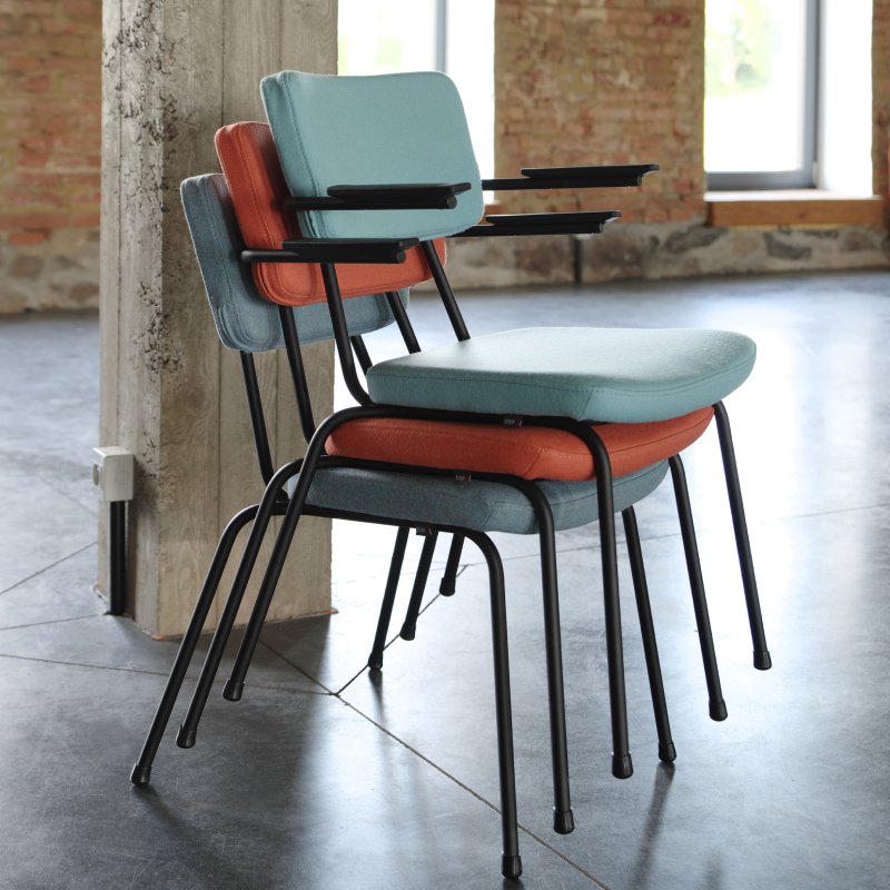 Stoel Epocc met armleuningen is een comfortabele horeca/kantinestoel die een jaren '50 stijl heeft. De combinatie van de kleurrijke frames en mogelijke stofferingen en kleuren van de rugleuning en zitting fleurt jouw interieur direct op. De voeten van de stoel zijn altijd in zwart kunststof.