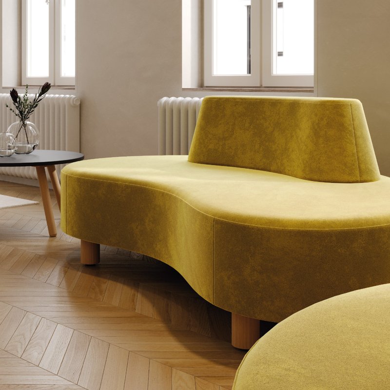 De grote gebogen hocker is mogelijk met of zonder rugleuning. De comfortabele poef is verkrijgbaar in vele kleuren en diverse stoffen die Nubi een unieke look geven.