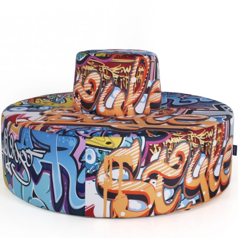 Ziteiland rond met graffiti print is een fraaie zitbank voor in een ontvangsthal, schoolaula of kantine. Het zitelement is voorzien van een comfortabele rugleuning en kleurrijke print.