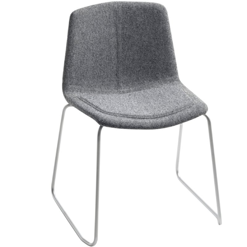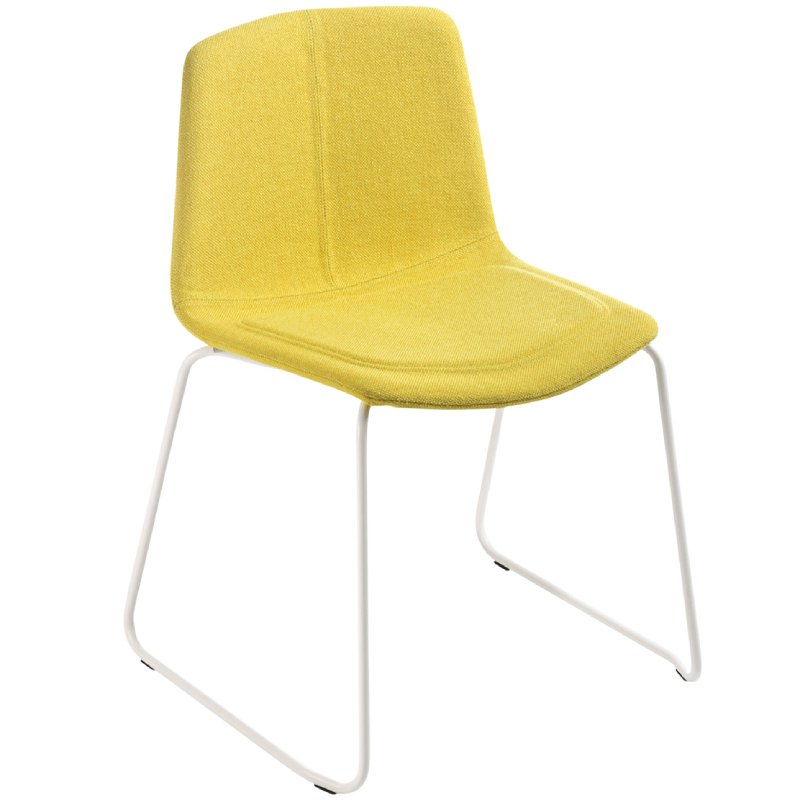 Kantinestoel Stratos slede gestoffeerd, een Italiaanse design stoel met een unieke zitkuip door de lichte vouw in het midden. Deze mooie stoel is volledig gestoffeerd in kleur naar keuze en te voorzien van armleggers voor extra zitcomfort.