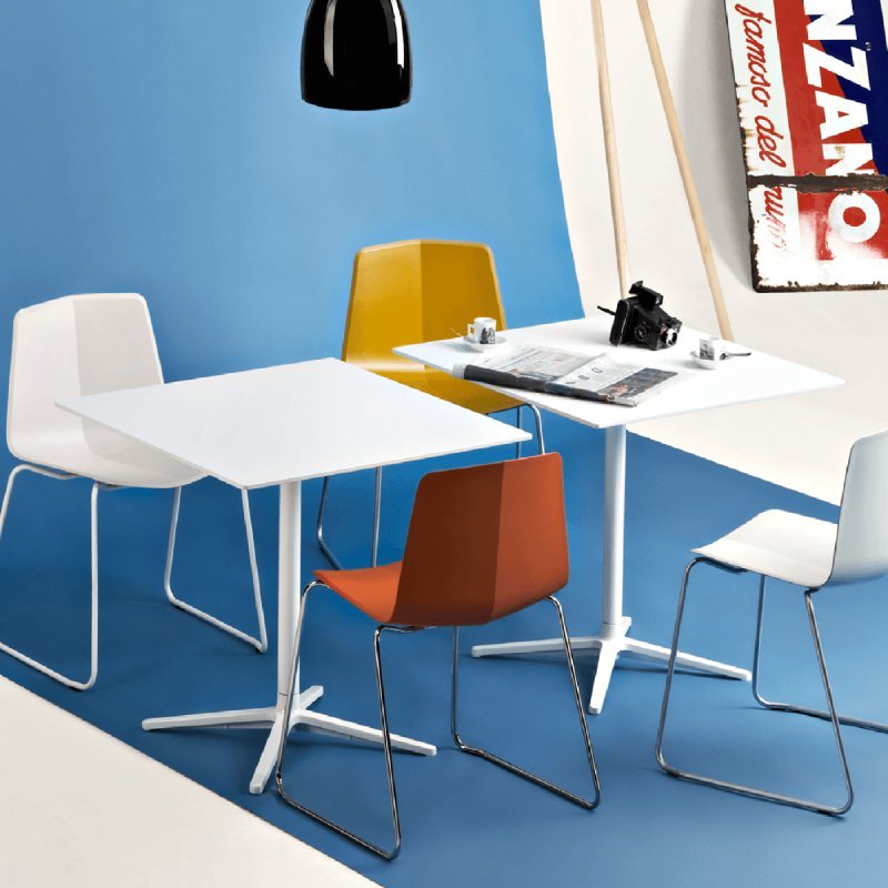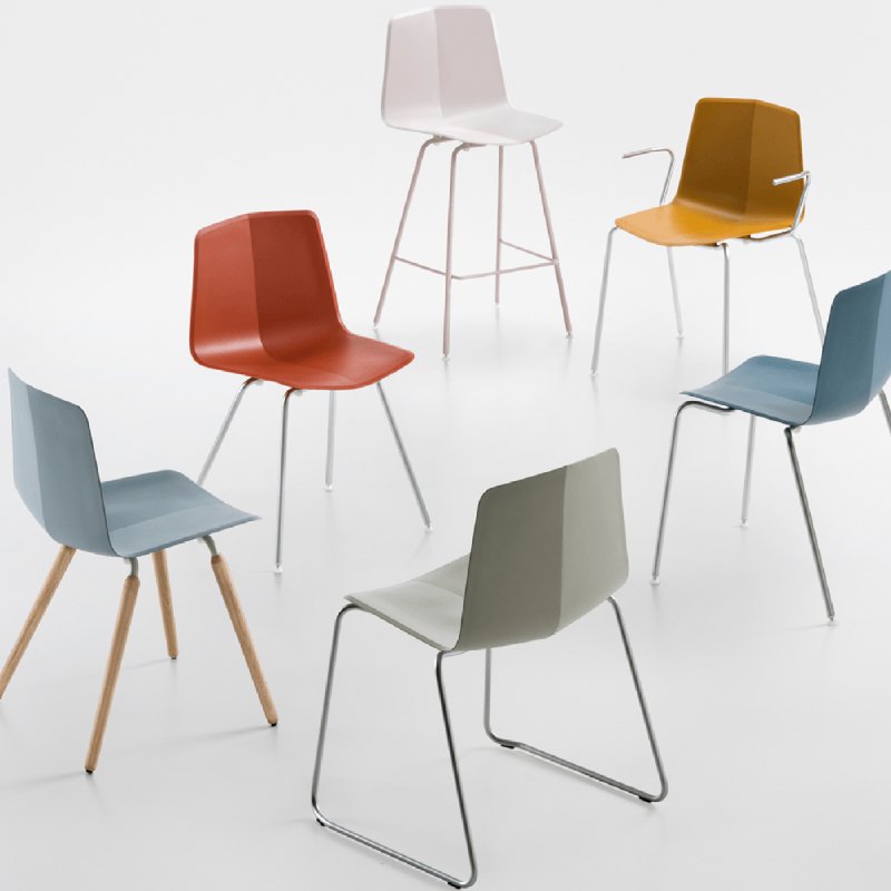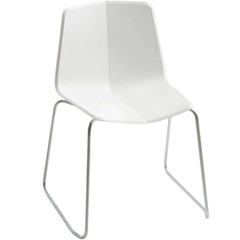 Kantinestoel Stratos slede kunststof, een Italiaanse design stoel met een unieke zitkuip door de lichte vouw in het midden. Deze mooie stoel heeft een stevige kunststof zitschaal en is te voorzien van armleggers voor een optimaal zitcomfort.